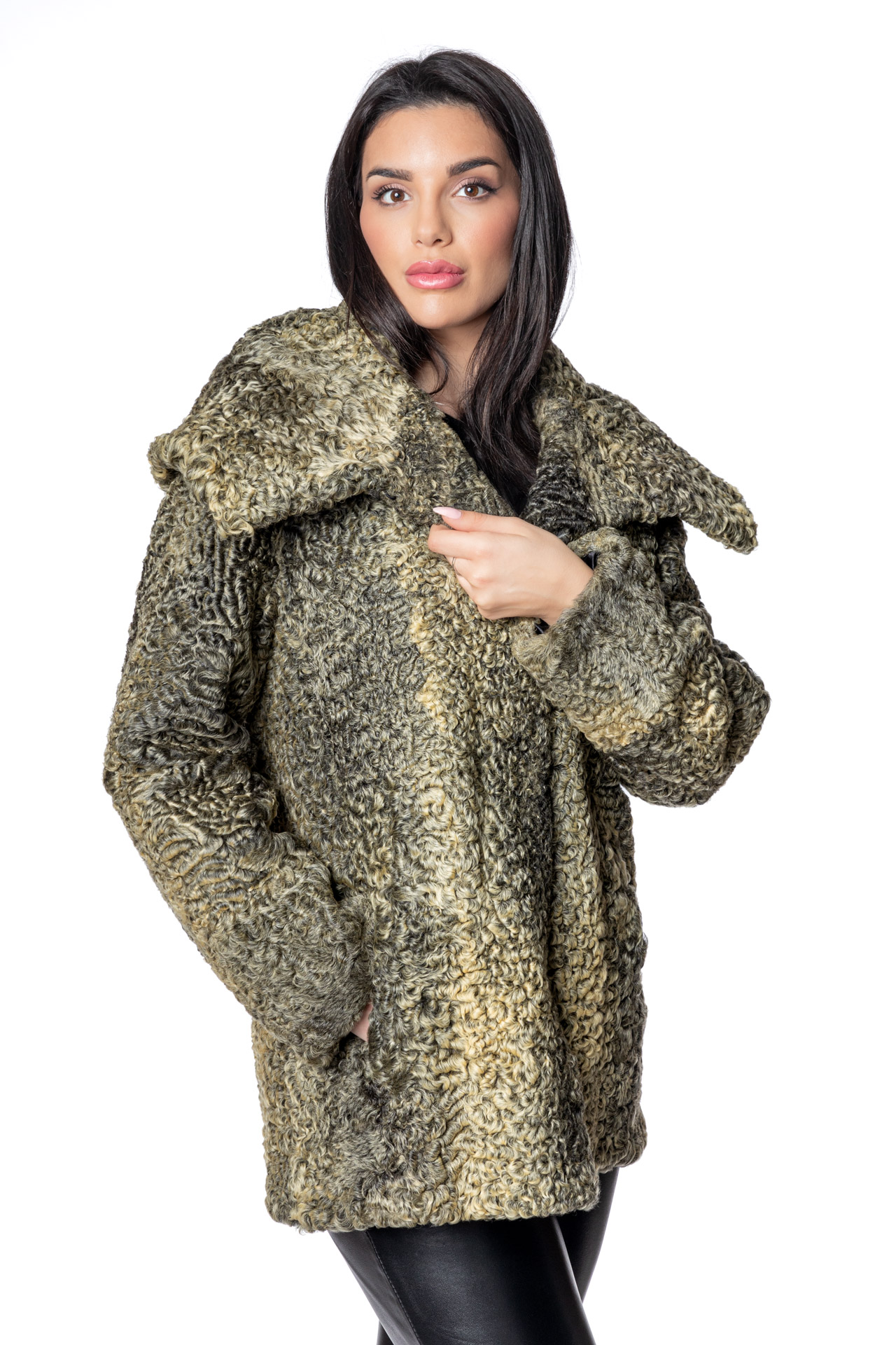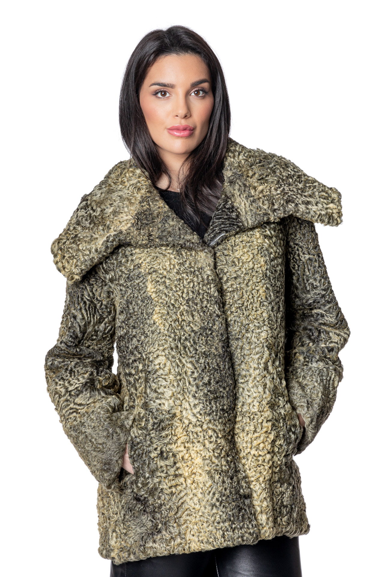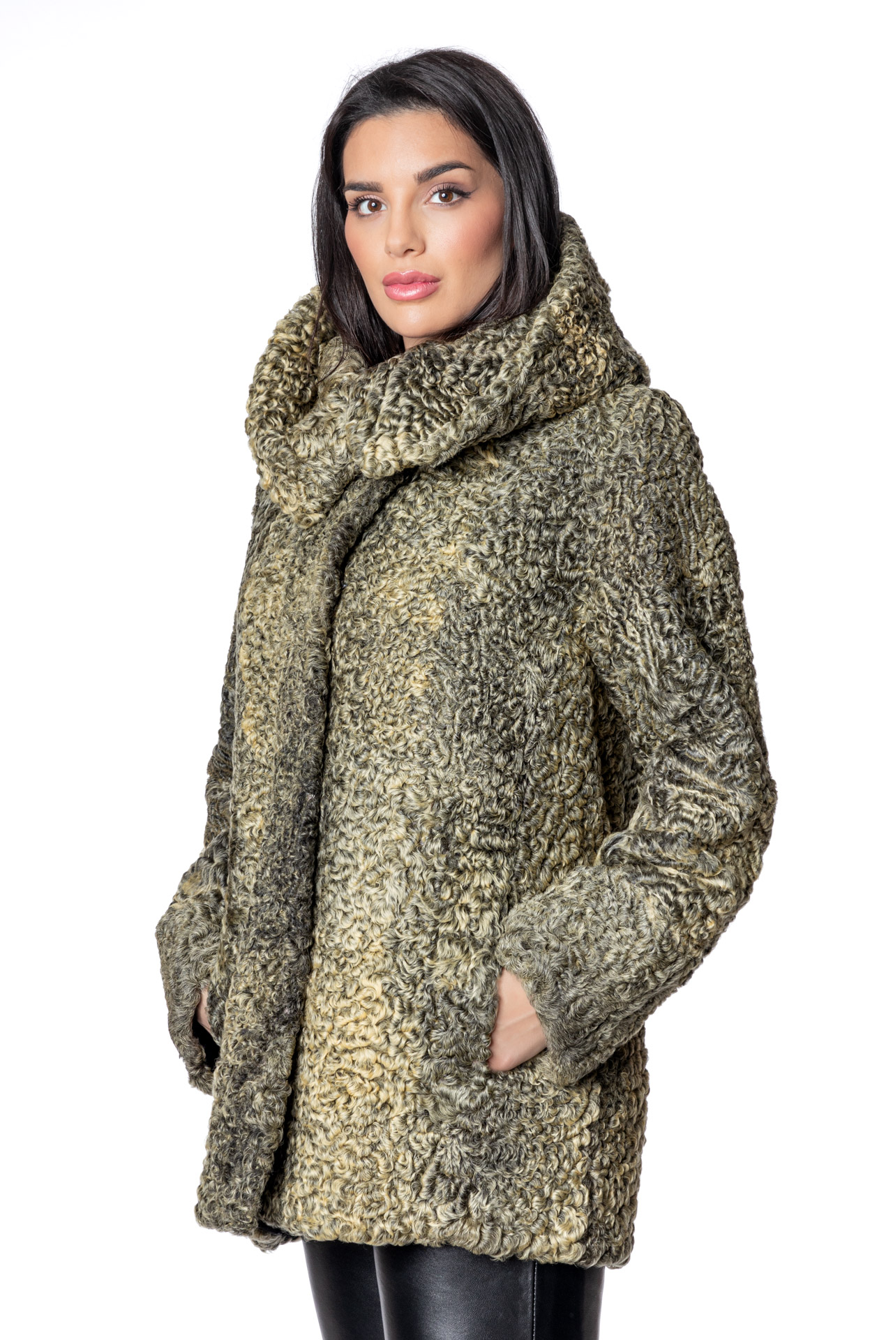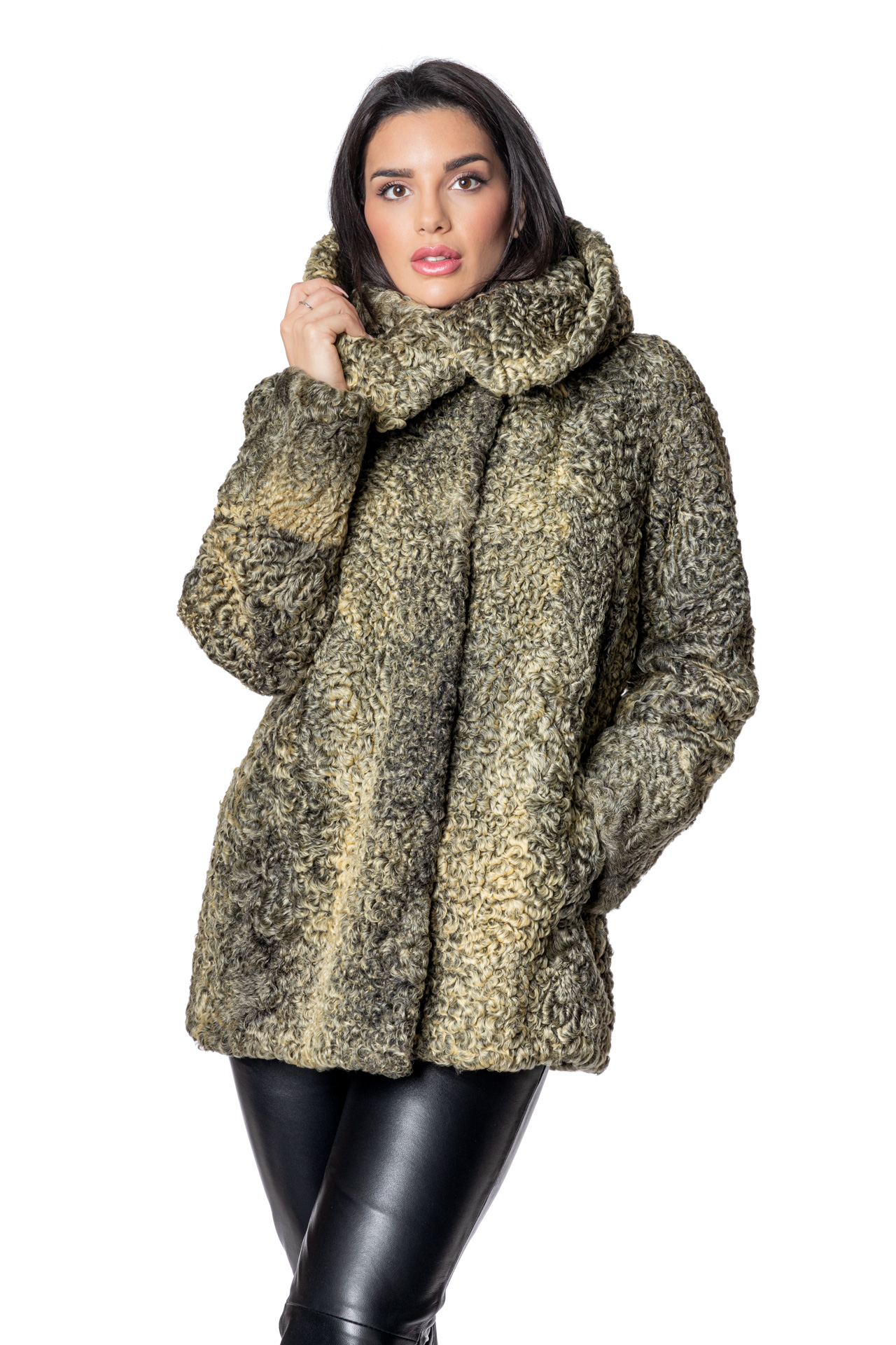 Κοντή ζακέτα αστραγκάν με μεγάλο εντυπωσιακό γιακά, με κρυφό κούμπωμα σε πράσινη – κίτρινη απόχρωση.