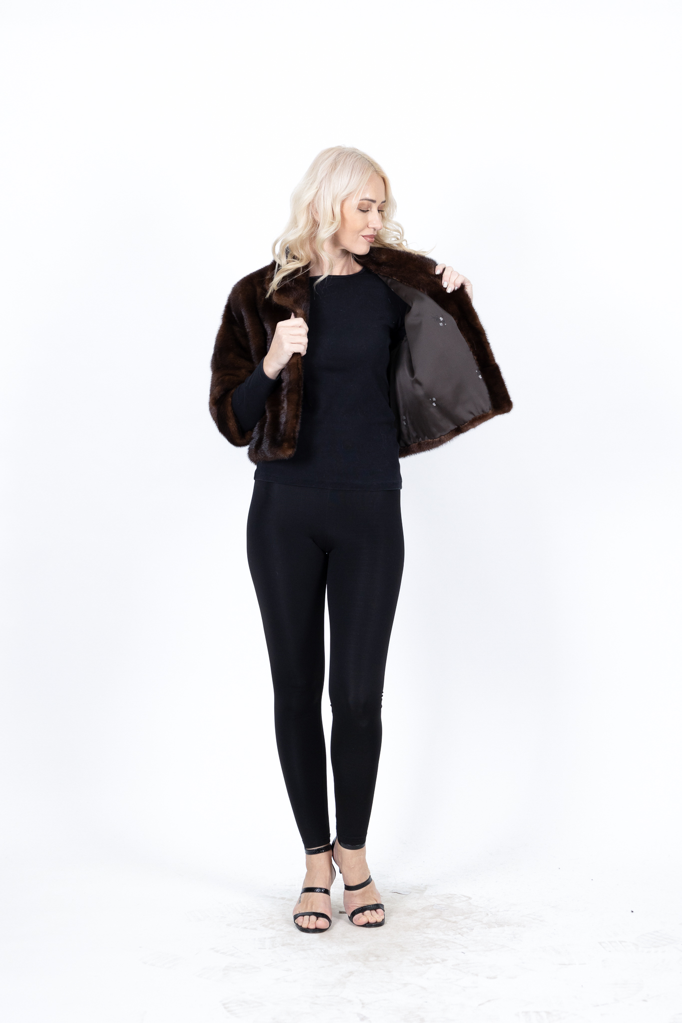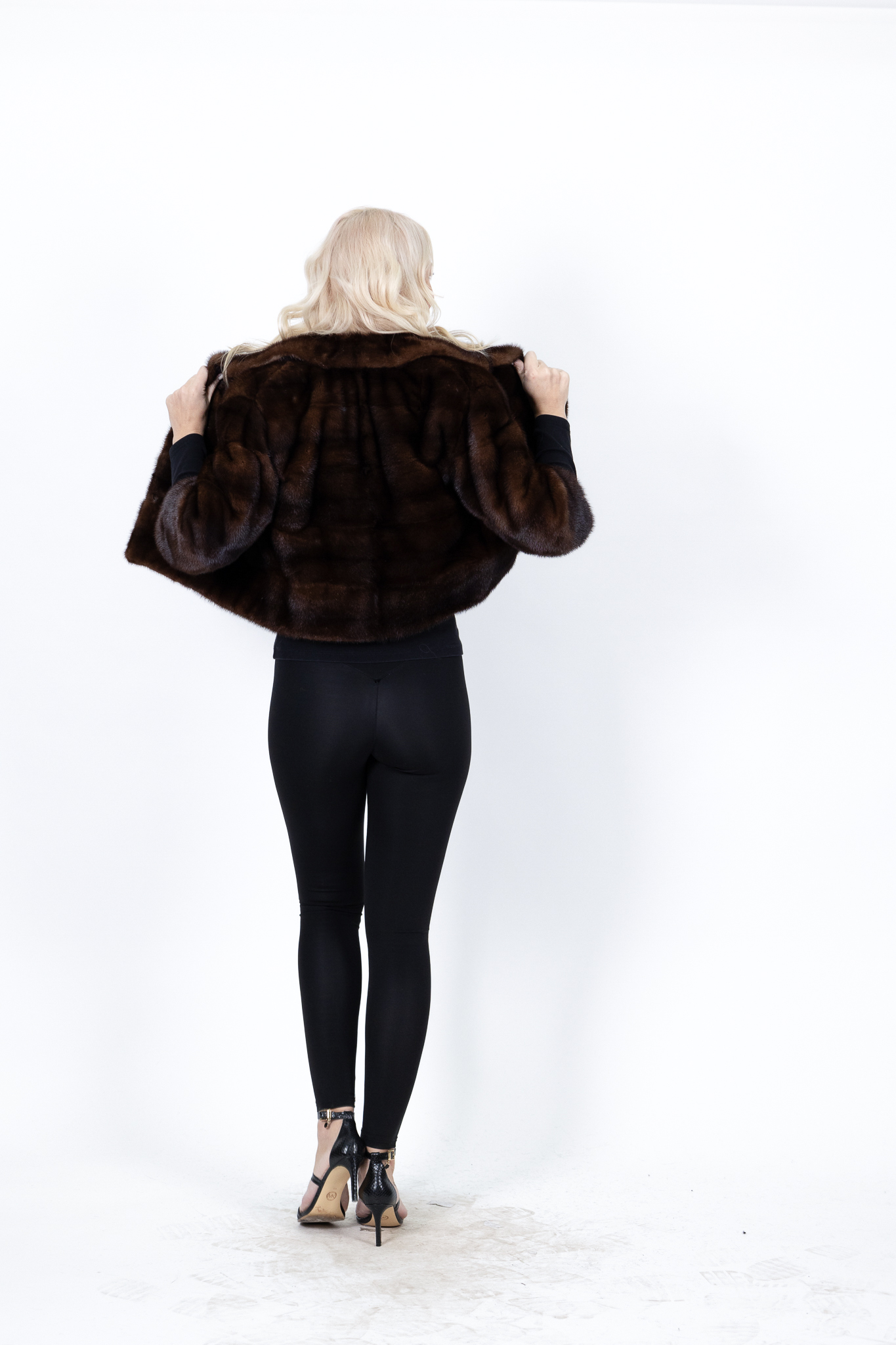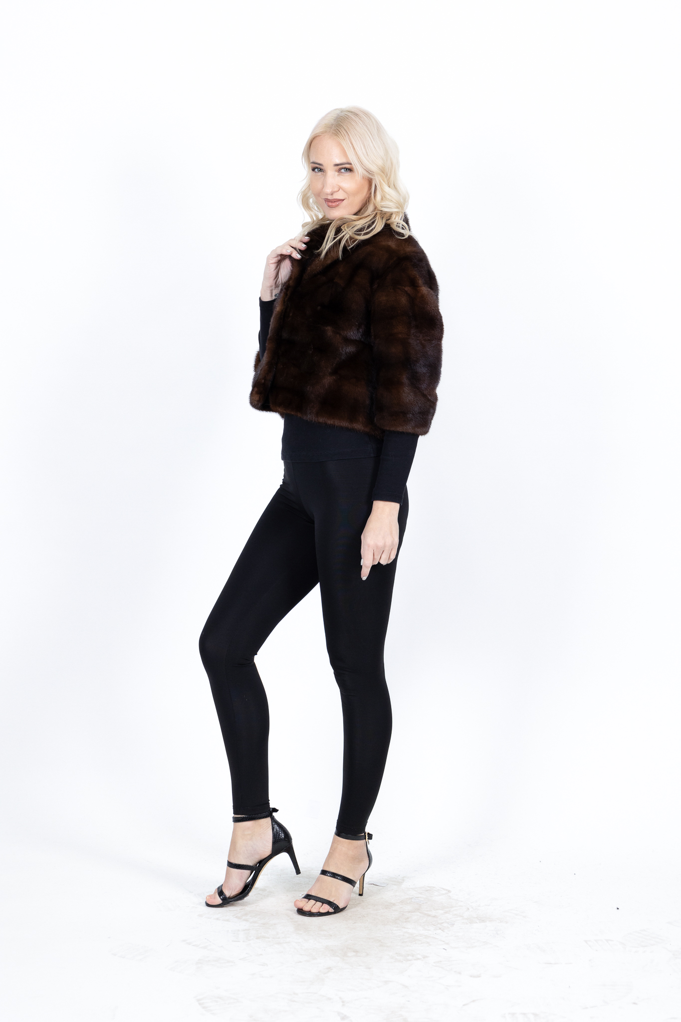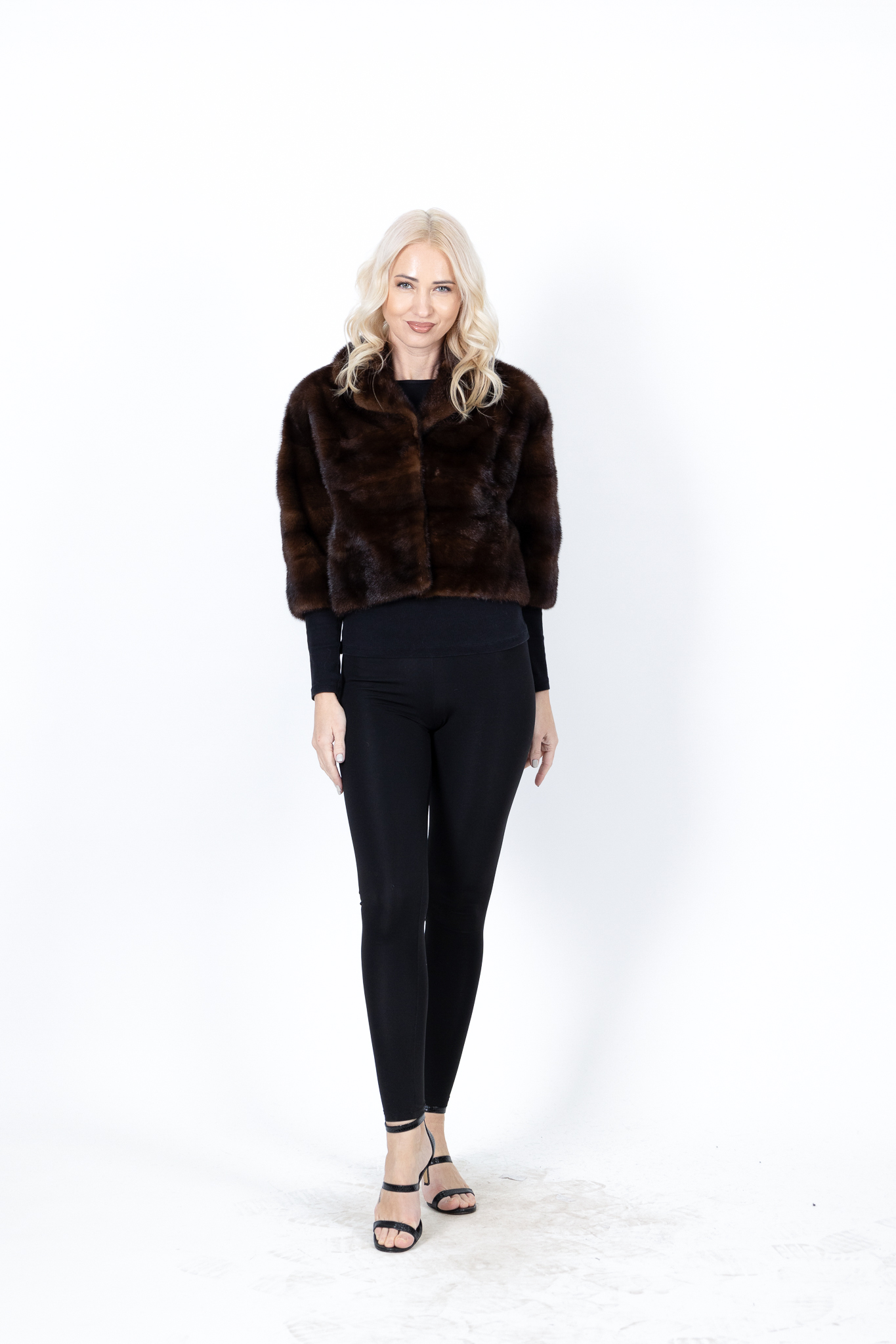 Γυναικεία βιζόν γούνα μονοκόμματη bolero καφέ σκούρο με πέτο γιακά και 3/4 μανίκια.