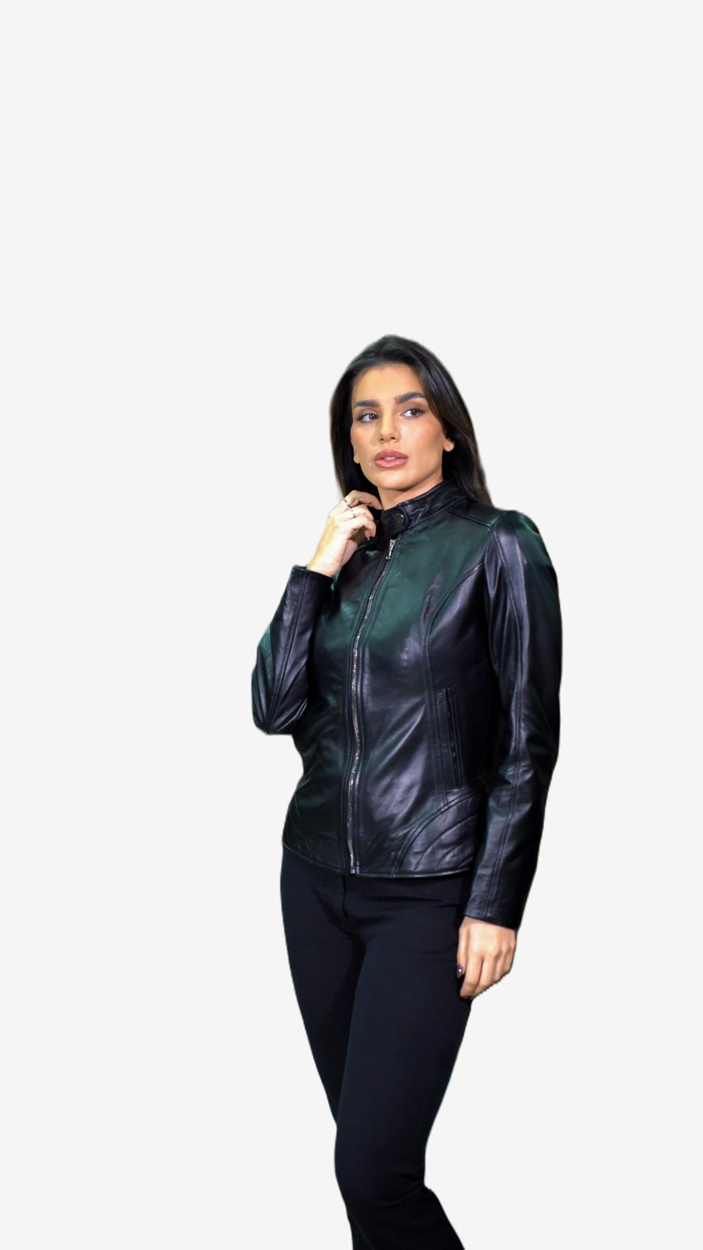 Γυναικείο μπουφάν σε στενή γραμμή , σε μαλακό δέρμα αρνί χρώμα μαύρο, με όρθιο γιακά και διακριτικό σχέδιο στα πλαϊνά.