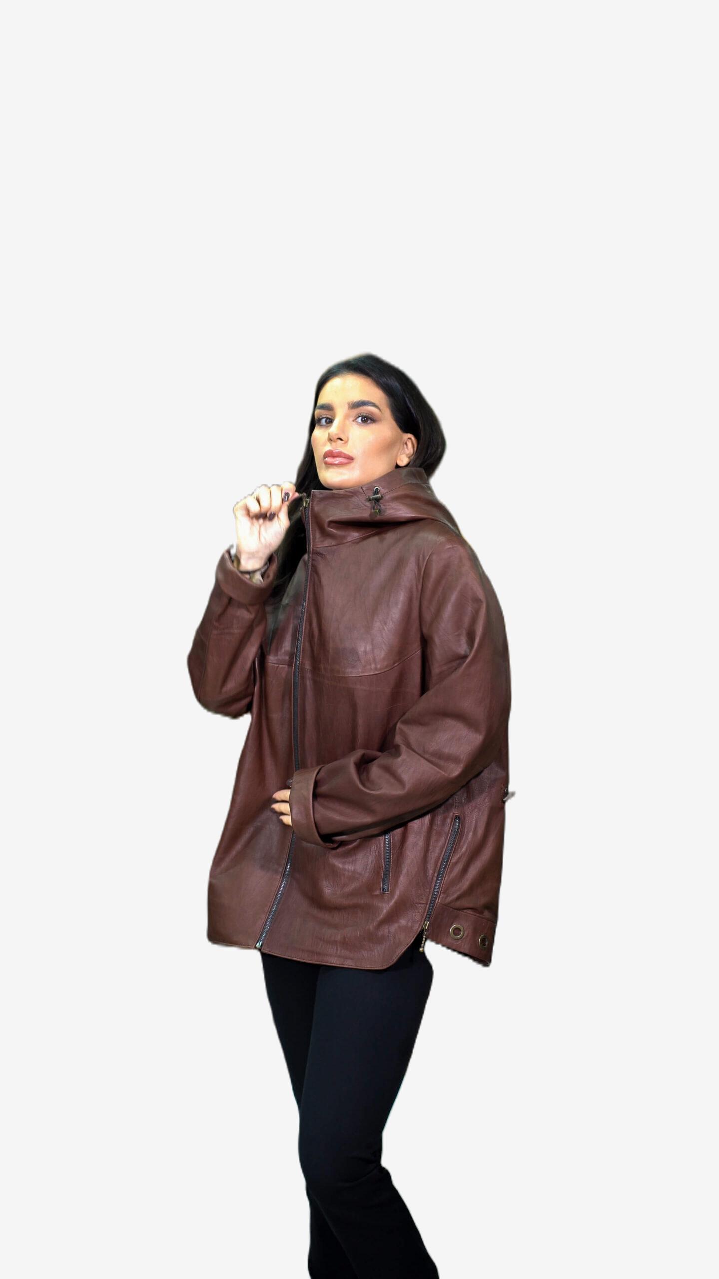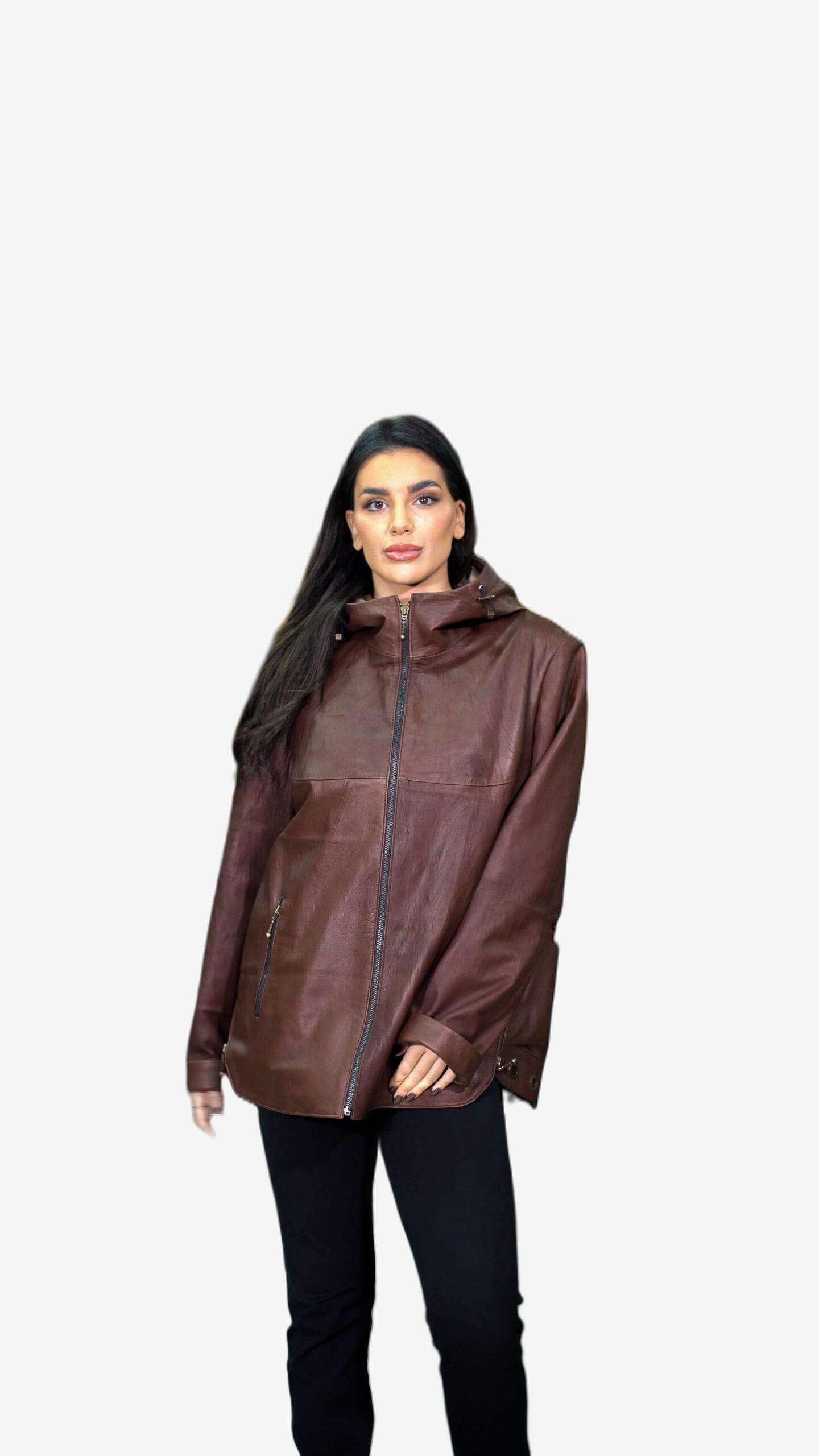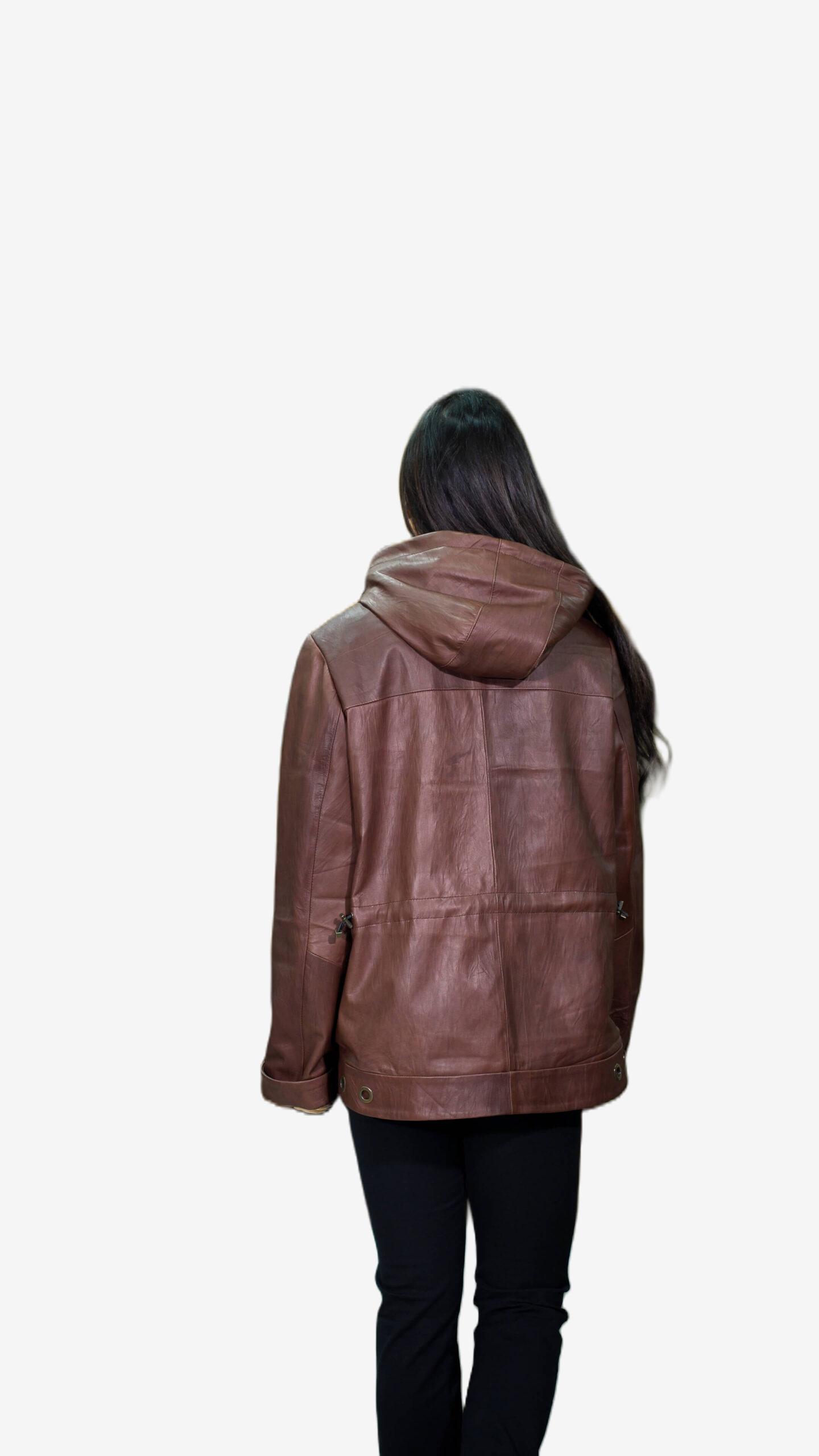 Γυναικείο μοντέρνο μπουφάν σε άλφα γραμμή, σε δέρμα αρνί, χρώμα καφέ τσαλακωτό, κουκούλα και κορδόνι αυξομείωσης πίσω στην μέση για καλύτερη εφαρμογή.