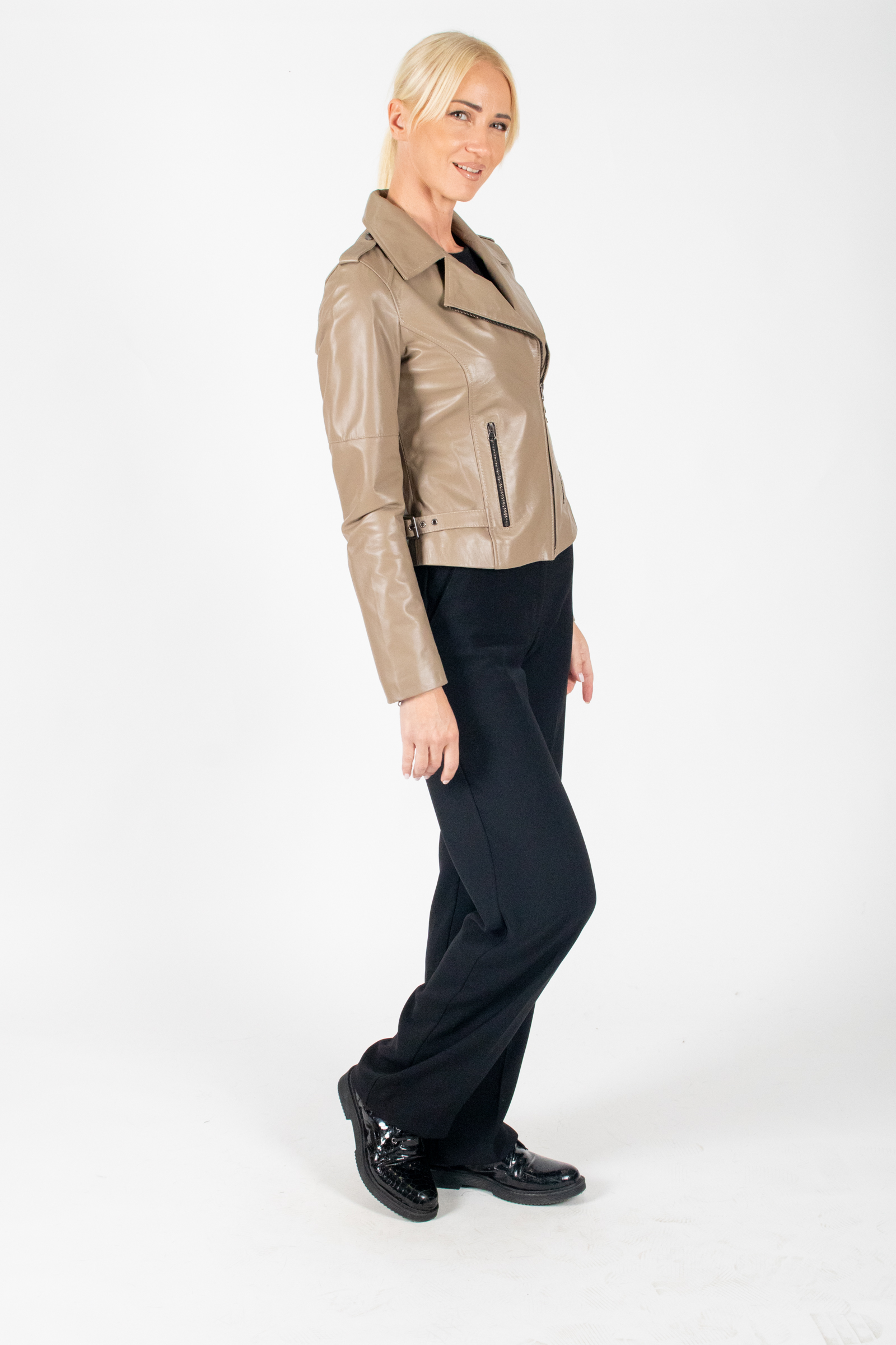 Γυναικείο δερμάτινο τύπου perfecto σε μπεζ μαλακό δέρμα αρνί με γιακά πέτο κεντρικό κούμπωμα με φερμουάρ πλα’ι’νό και εξωτερικές τσέπες με φερμουάρ, στενή γραμμή .