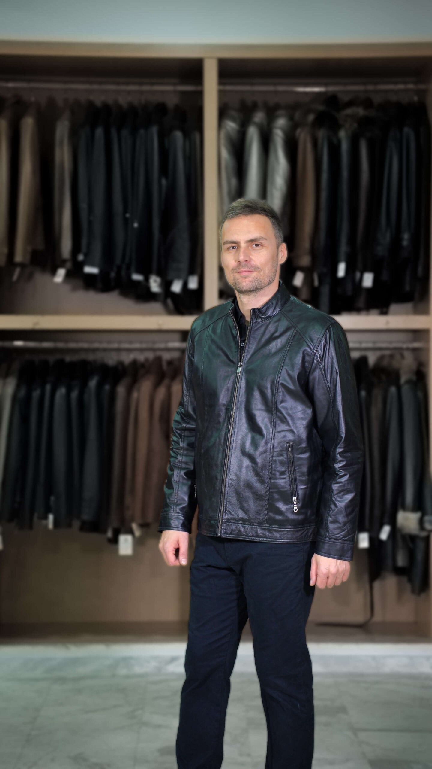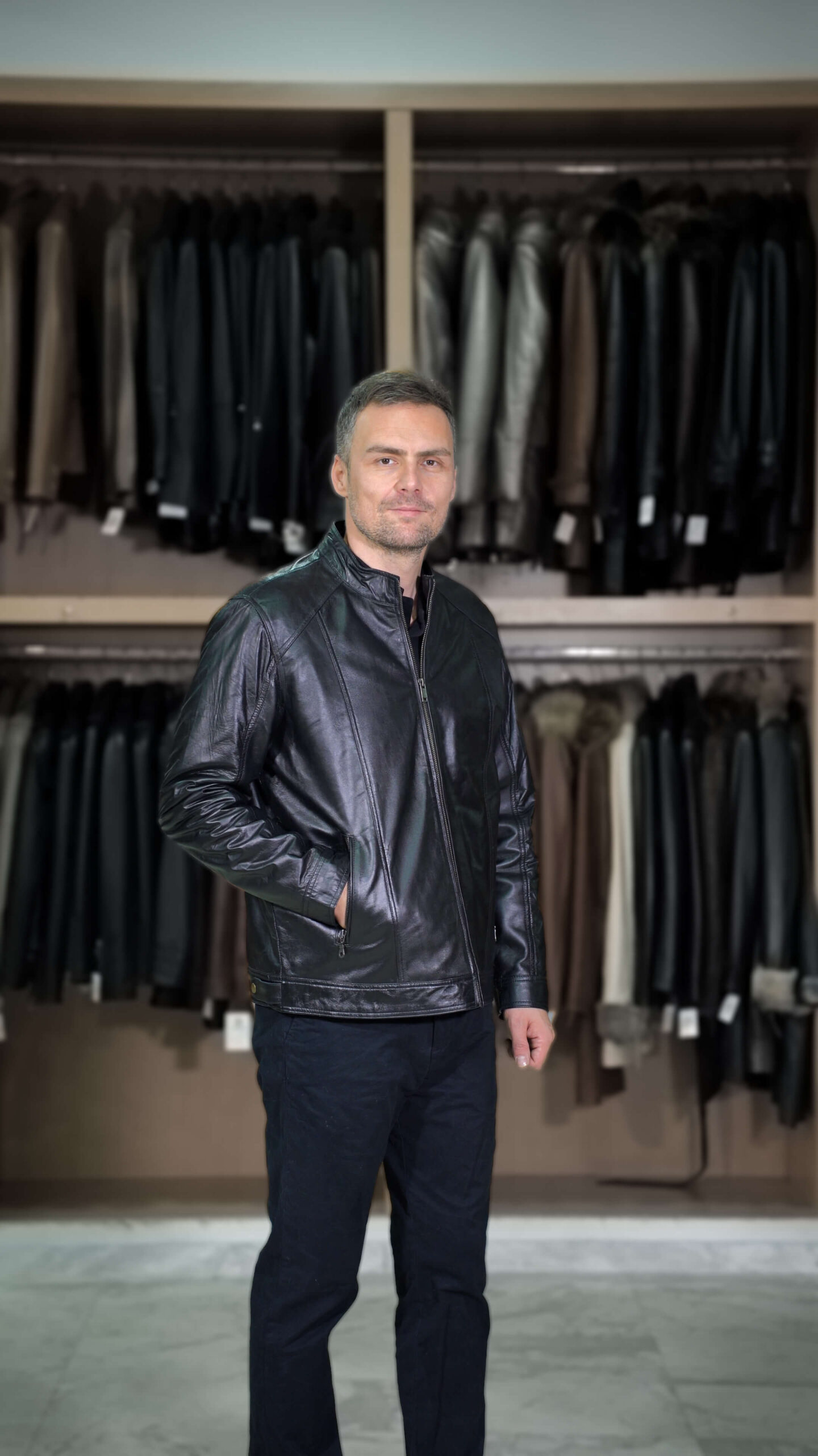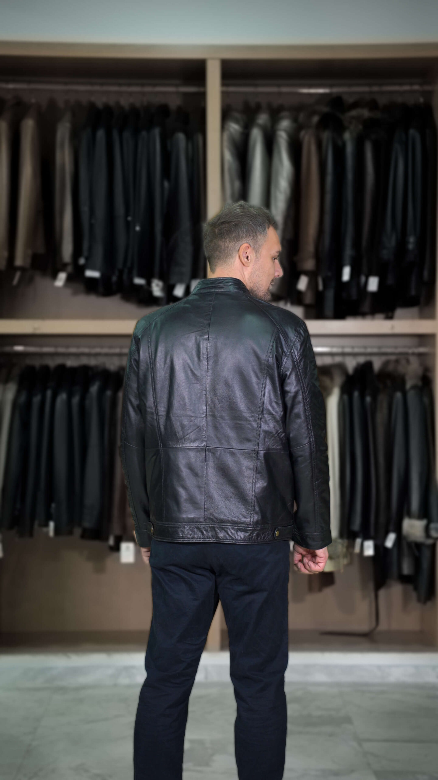 Ανδρικό μπουφάν σε δέρμα μοσχάρι, χρώμα μαύρο σε ίσια γραμμή με όρθιο γιακά και οι δύο εξωτερικές τσέπες κλείνουν με φερμουάρ.
