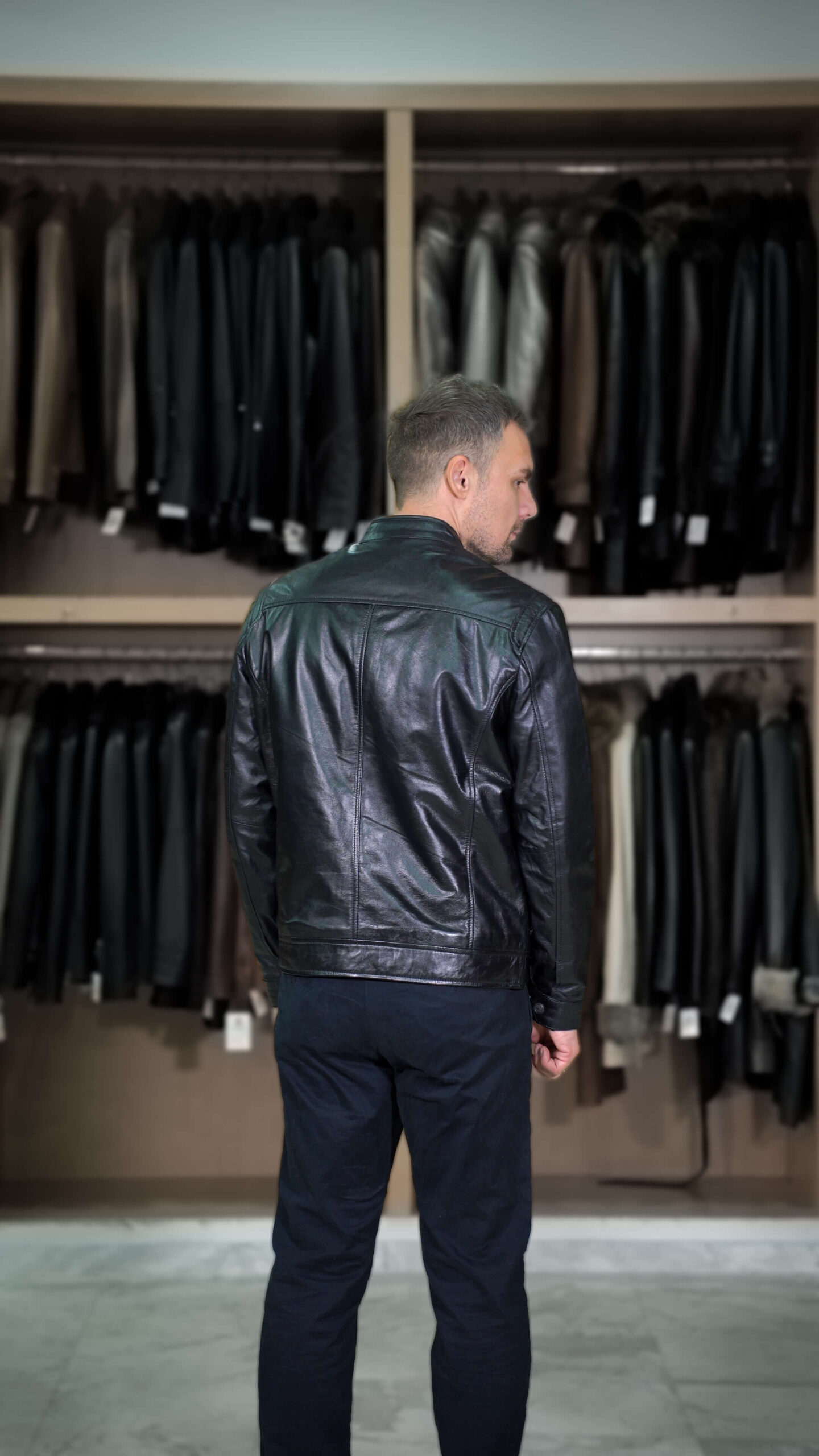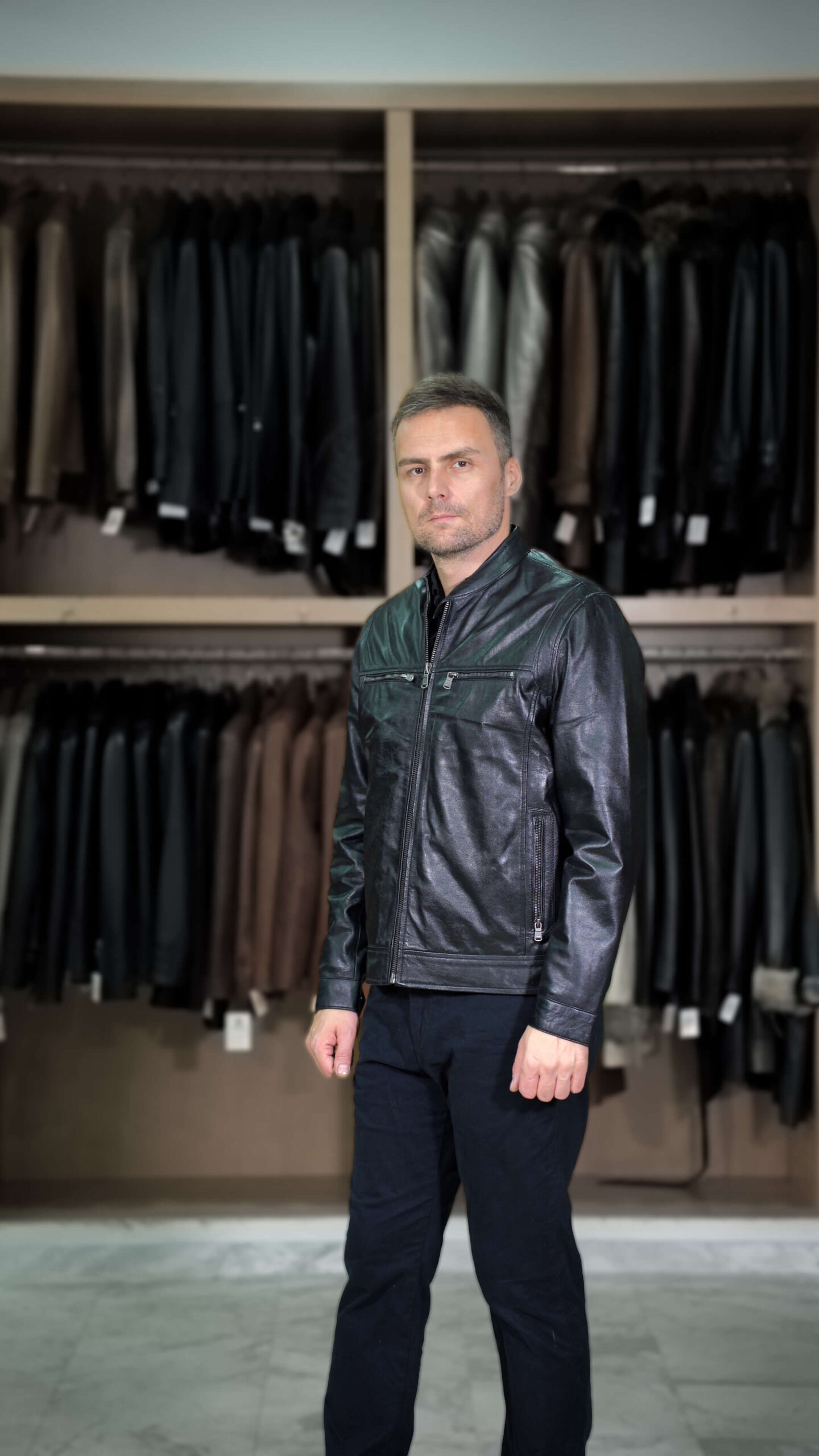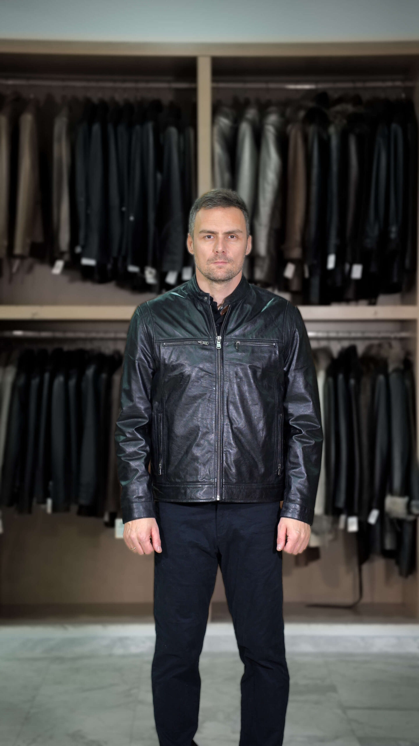Ανδρικό μπουφάν σε δέρμα μοσχάρι, χρώμα μαύρο σε ίσια γραμμή με όρθιο γιακά και οι τέσσερις εξωτερικές τσέπες κλείνουν με φερμουάρ.