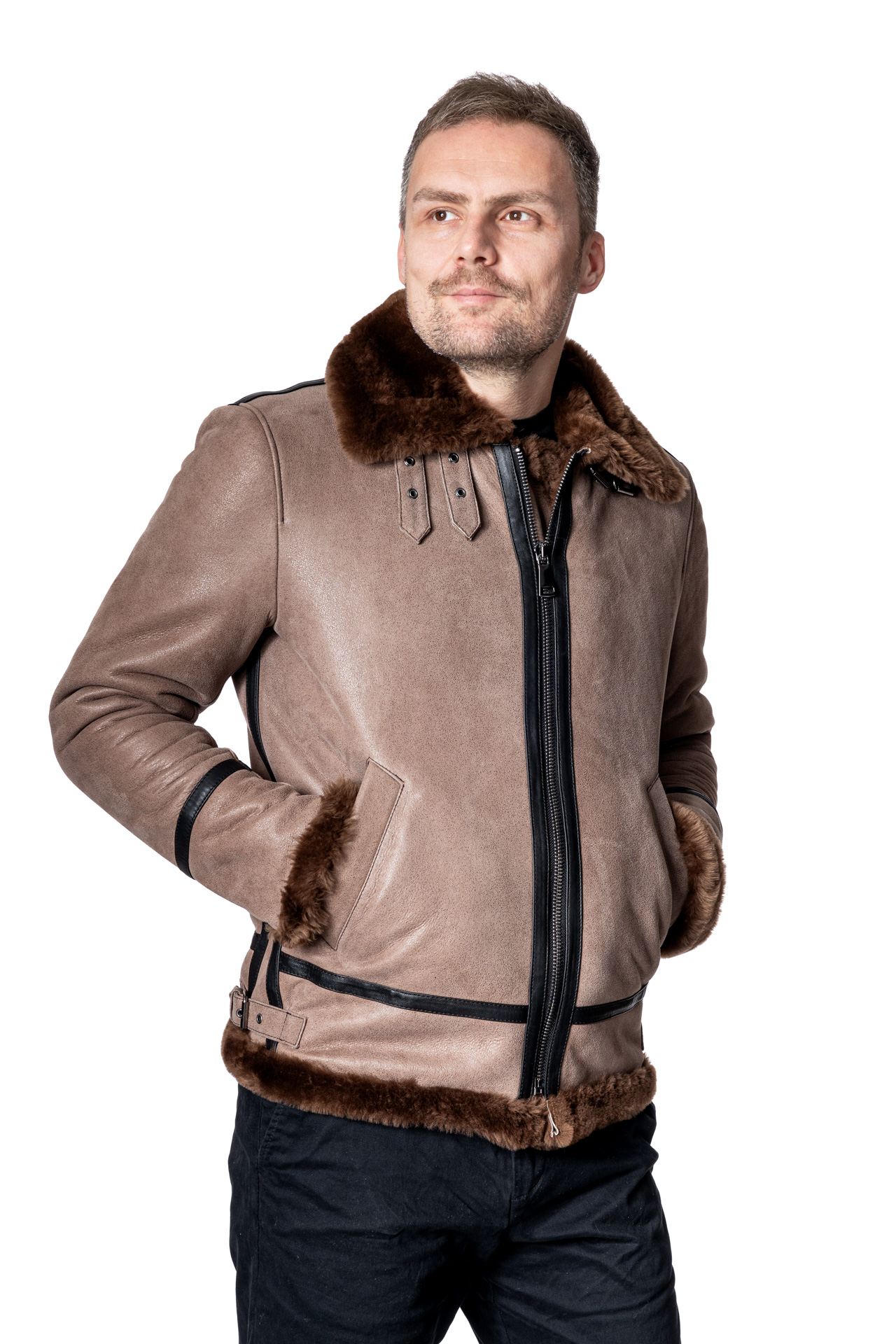 Ανδρικό μουτόν bomber σε κανονική γραμμή με κανελί γούνα και ώχρα δέρμα στην εξωτερική όψη δεν έχει εσωτερικές τσέπες είναι αληθινή γούνα, τα μανίκια κάνουν ρεβέρ και έχει λουρί στον γιακιά.