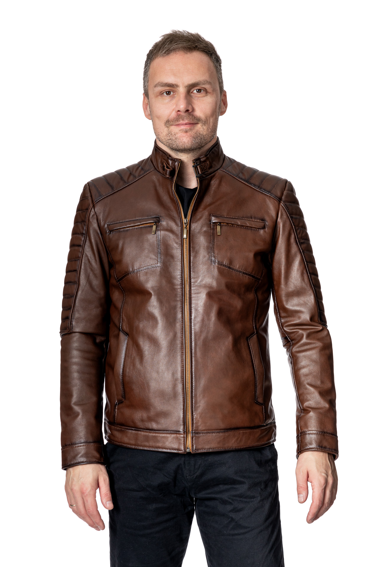 Ανδρικό δερμάτινο μπουφάν σε ταμπά μαλακό δέρμα αρνί με σχέδιο γαζί και μαύρες σκιές, εξωτερικές τσέπες με φερμουάρ και 2 εσωτερικές, με όρθιο γιακά σε στενή γραμμή.