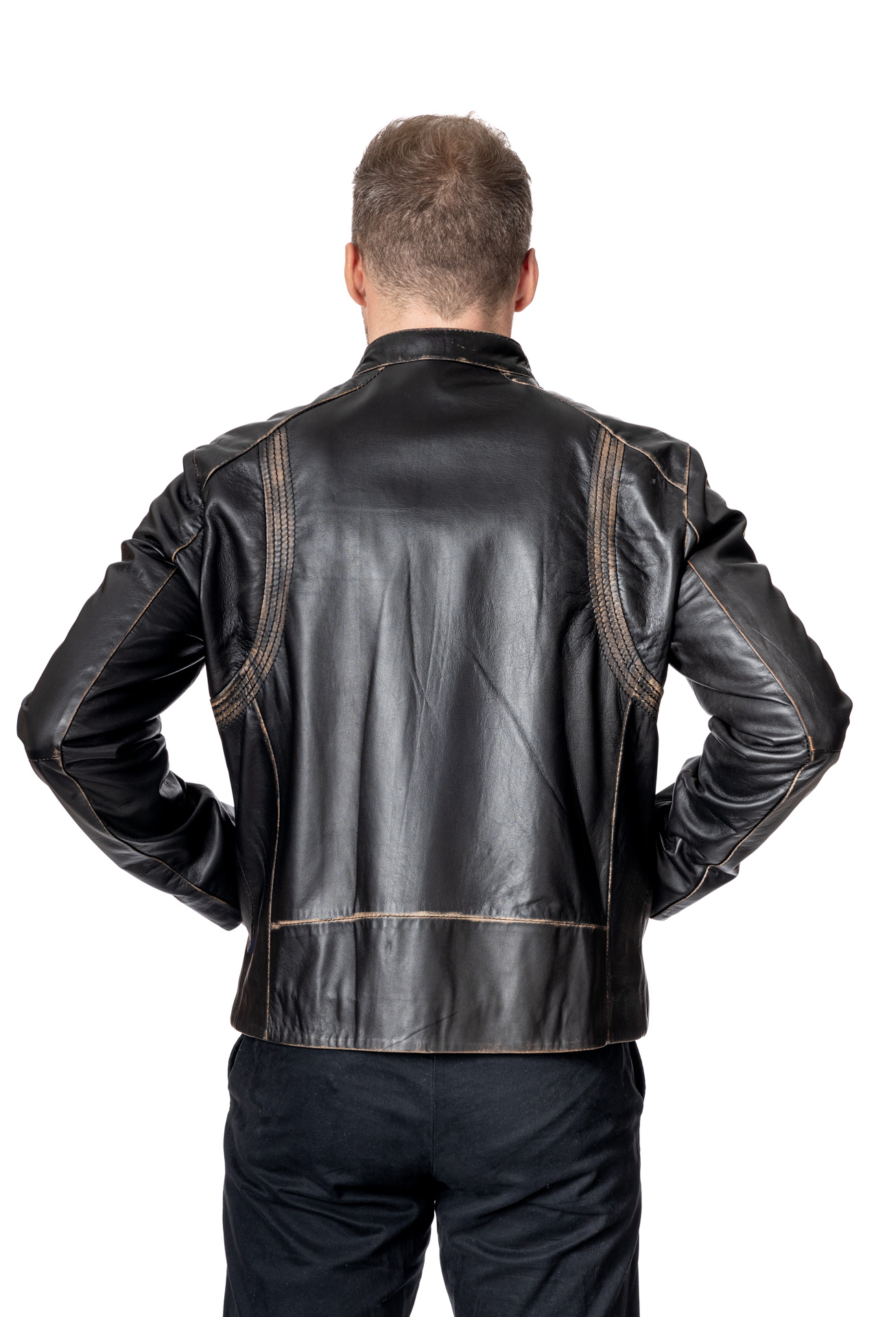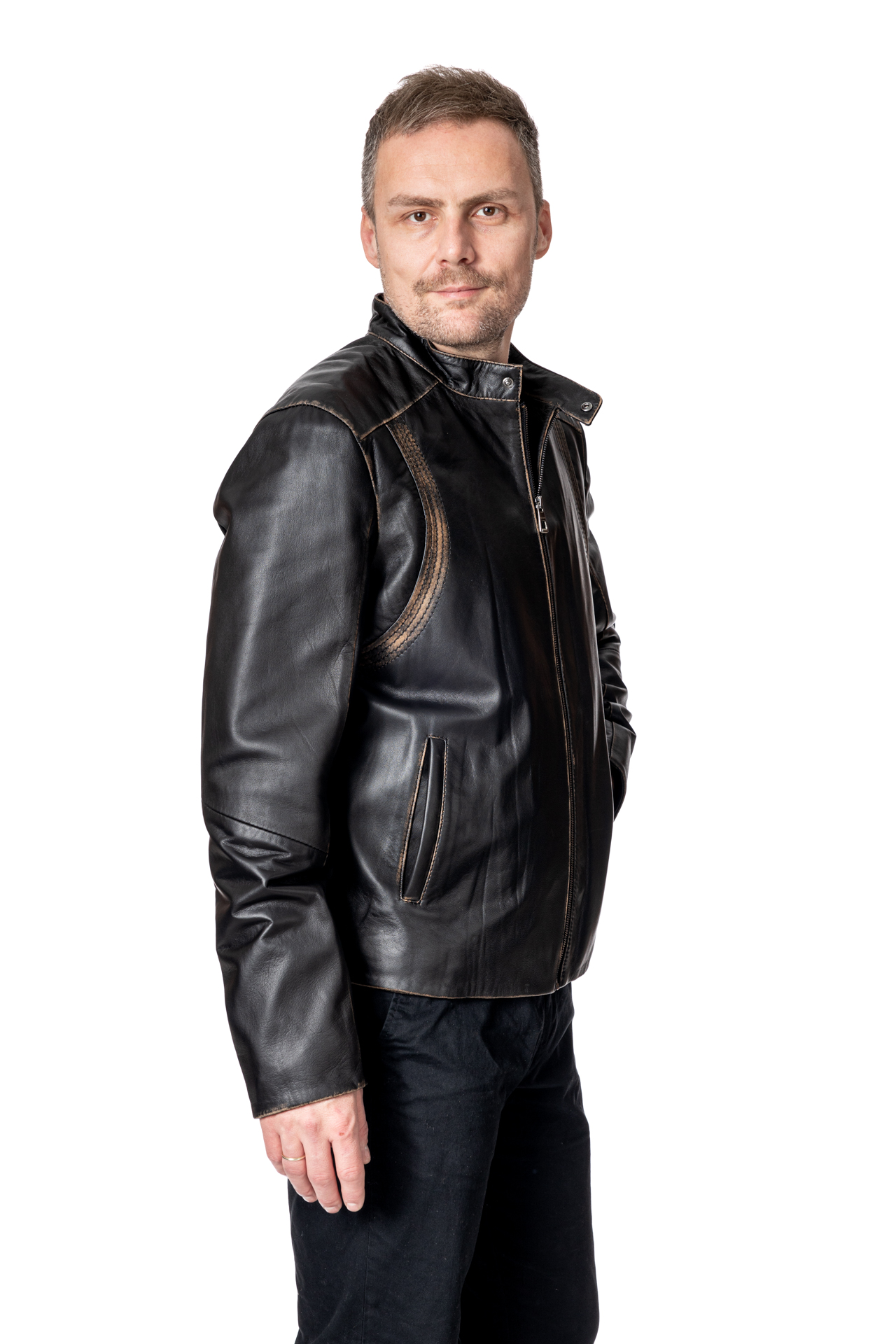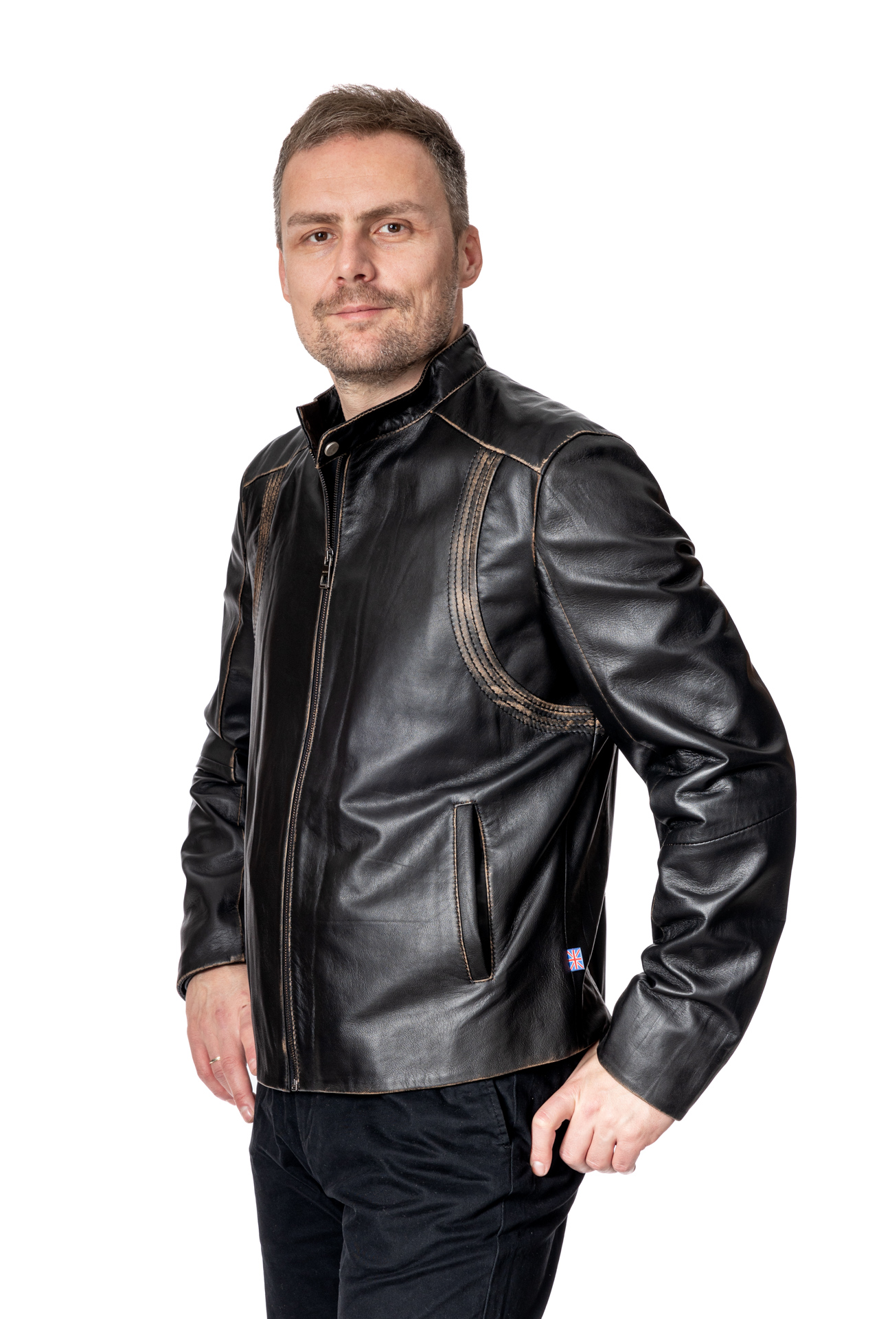 Ανδρικό δερμάτινο σε καφέ σκούρο μαλακό δέρμα αρνί πετροπλυμένο, με όρθιο γιακά και εσωτερικές τσέπες σε στενή γραμμή.