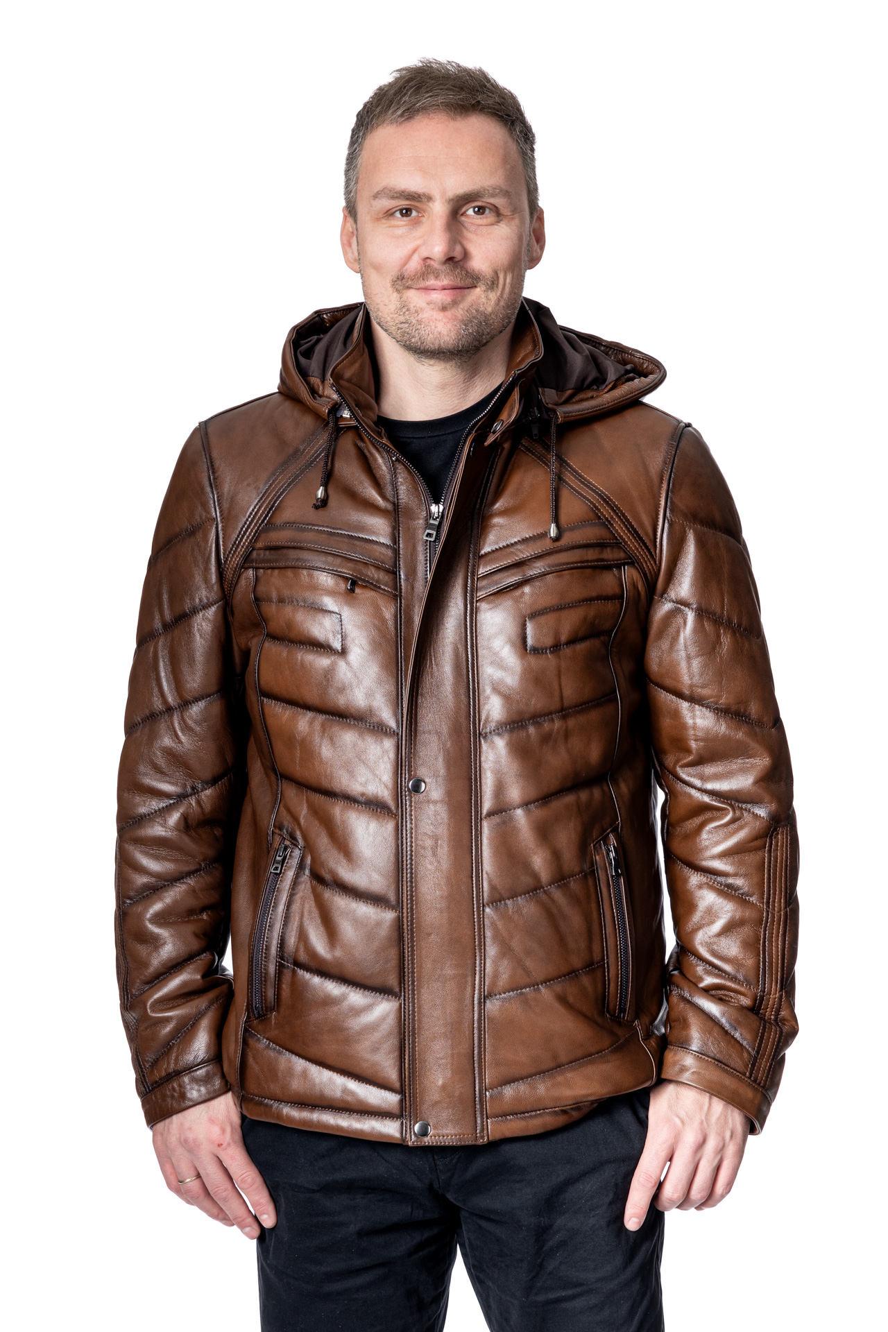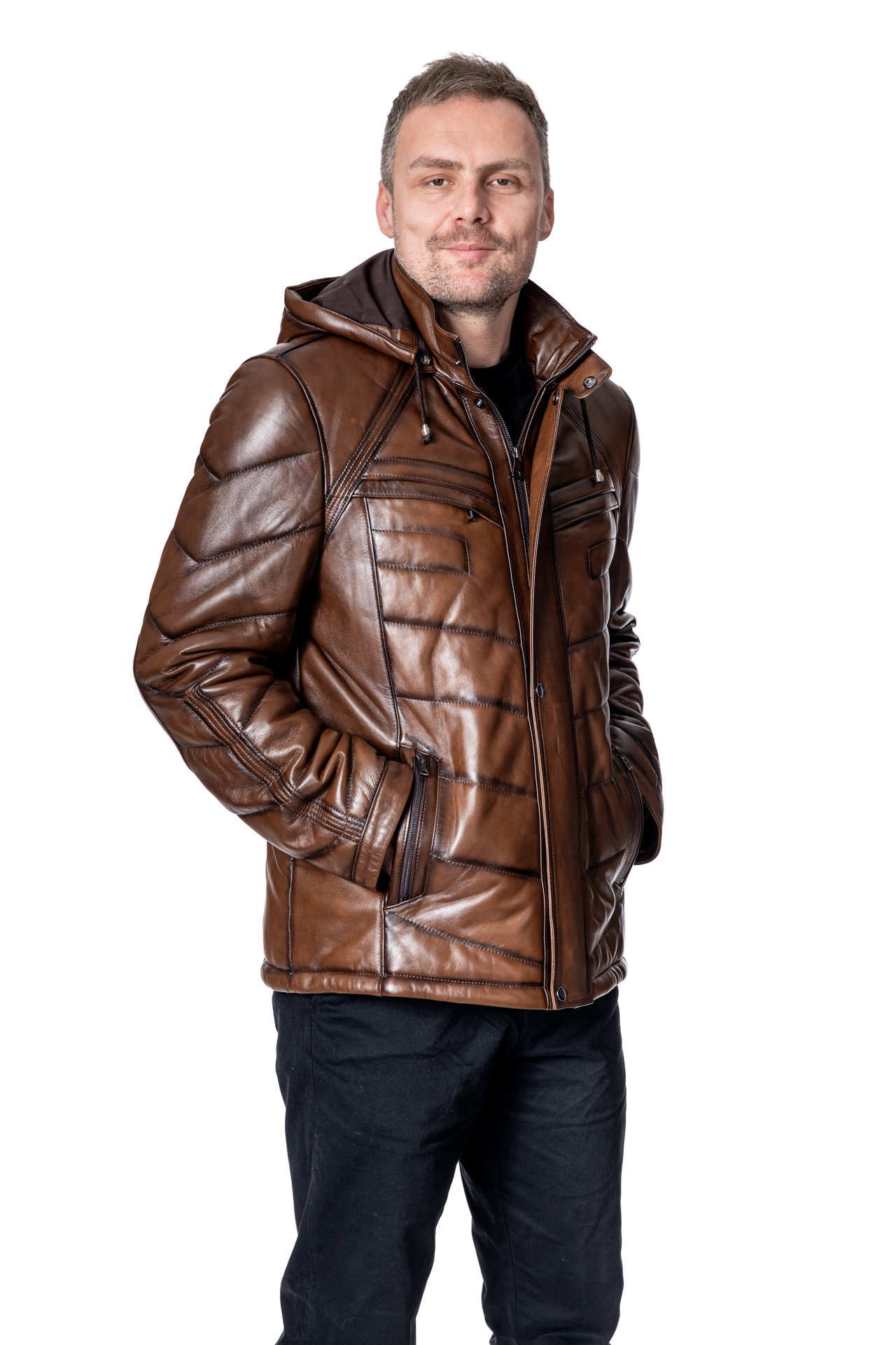 Ανδρικό δερμάτινο μπουφάν, από δέρμα αρνί, μακρύ φουσκωτό με αποσπώμενη κουκούλα σε ταμπά χρώμα έχει εξωτερικές τσέπες με φερμουάρ στο ύψος του στήθους και διπλές τσέπες για τα χέρια και εσωτερικές τσέπες.