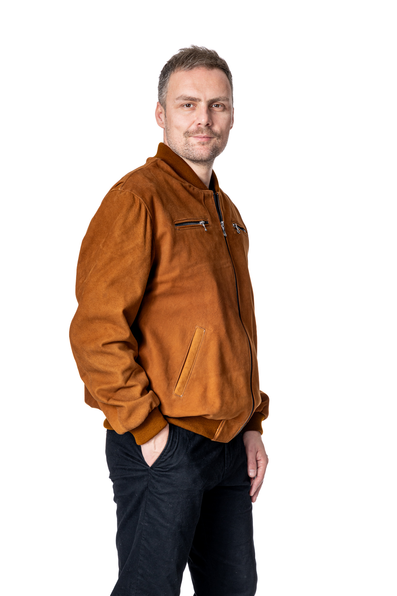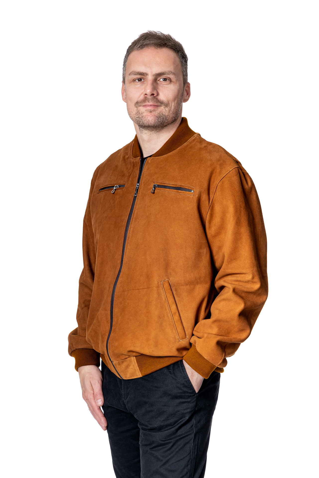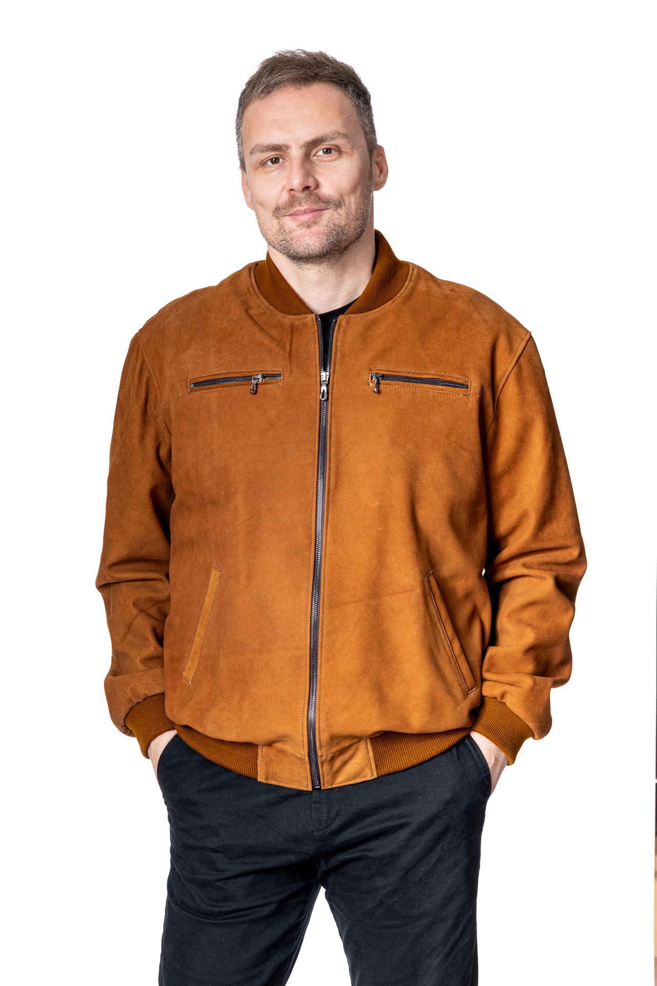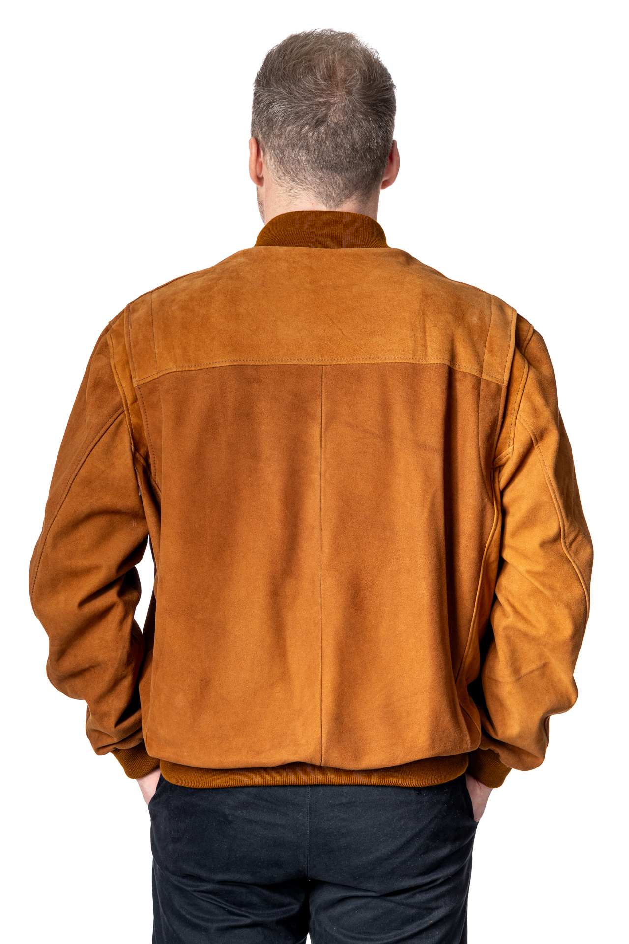 Ανδρικό δερμάτινο μπουφάν με λάστιχα σε ταμπά καστόρι μαλακό δέρμα και college γιακά σε κανονική γραμμή και εξωτερικές τσέπες με φερμουάρ στο στήθος , έχει 2 εσωτερικές τσέπες .