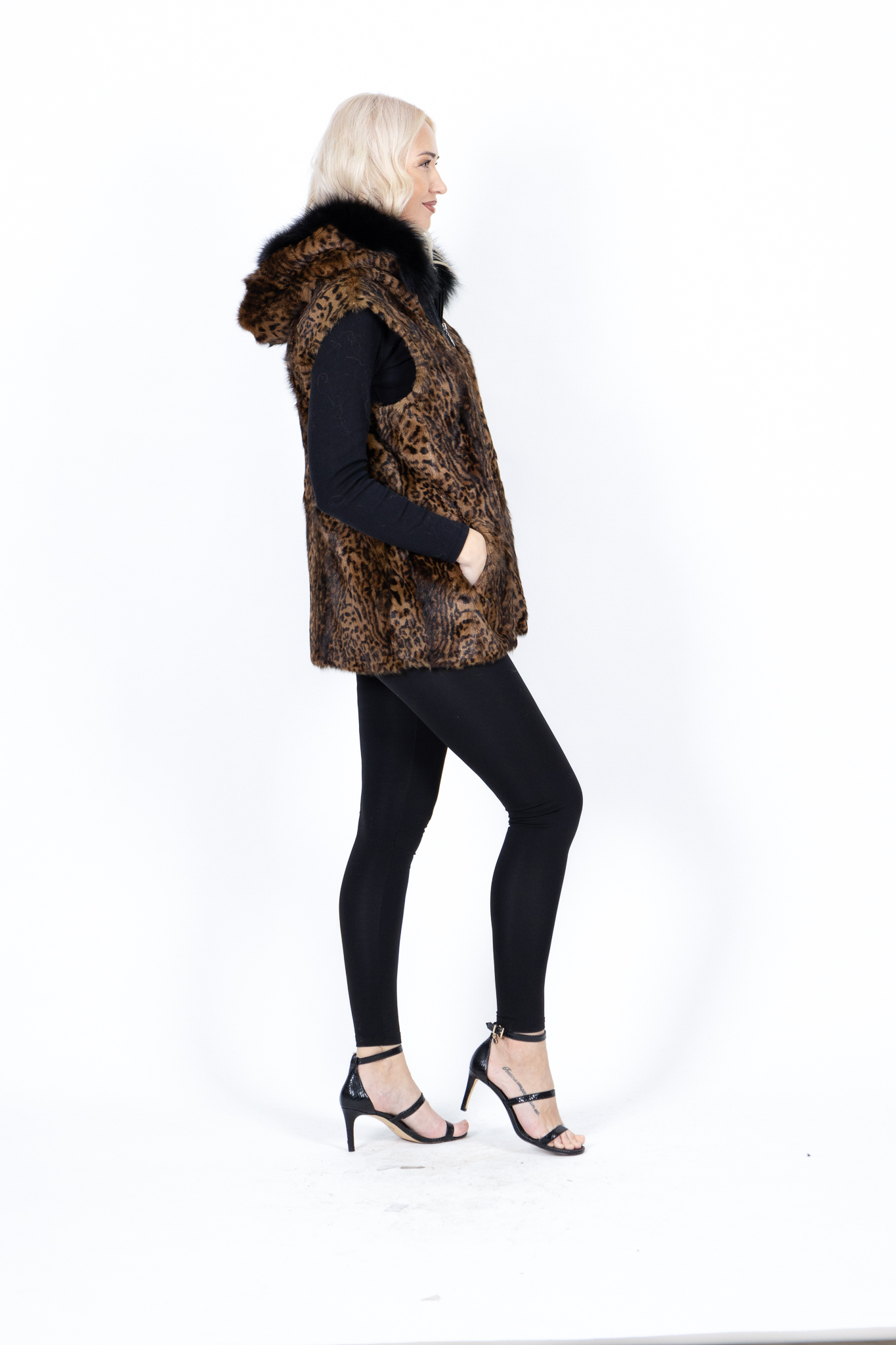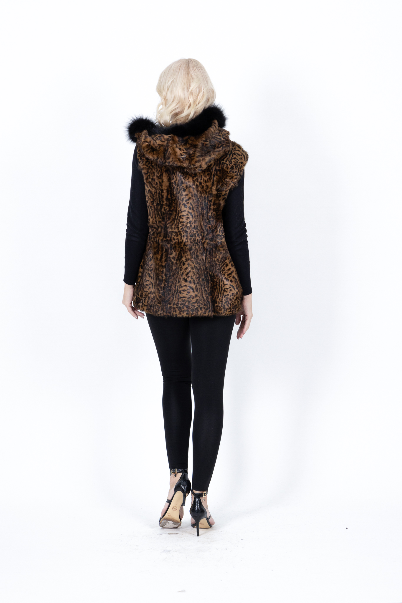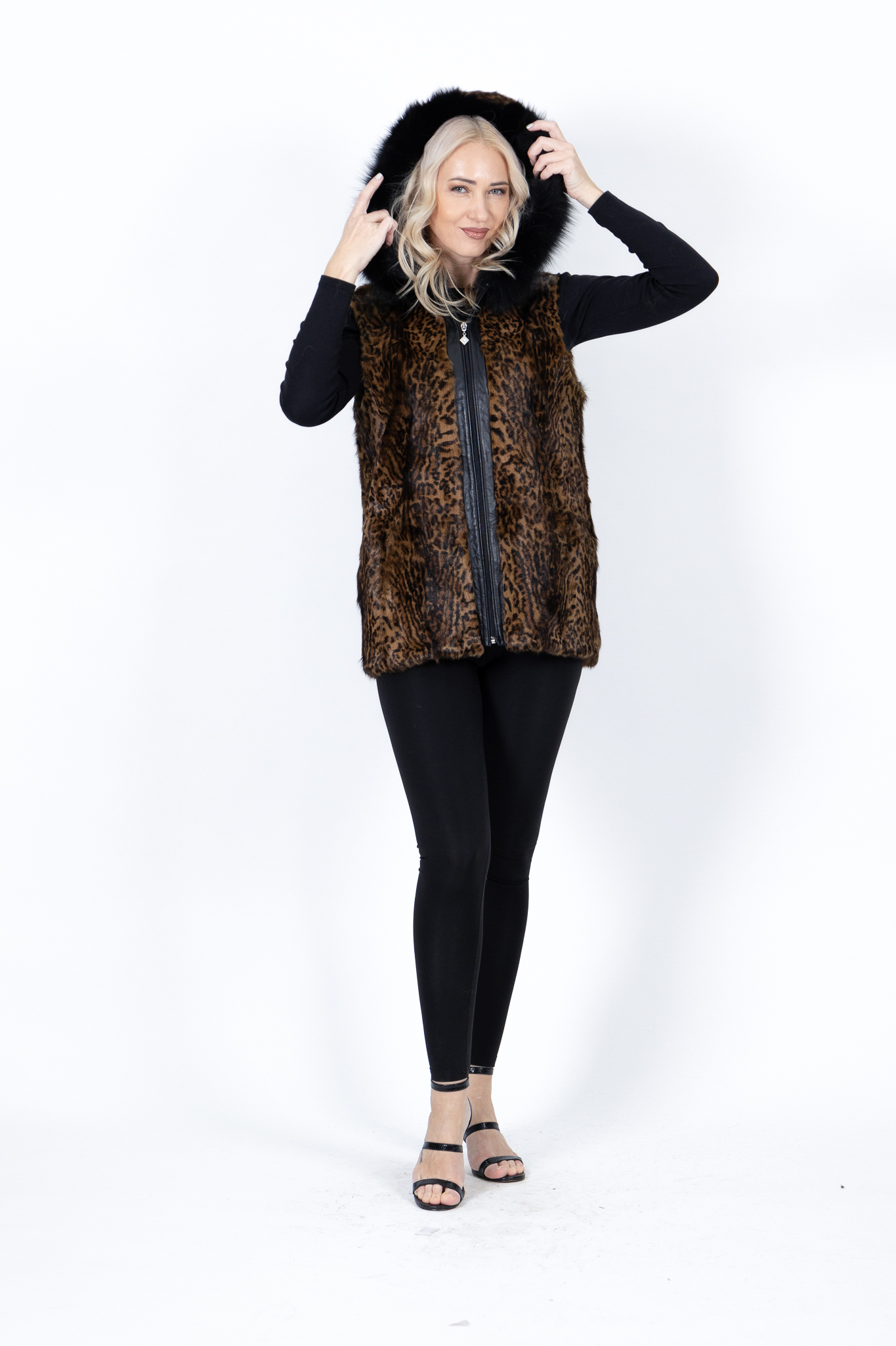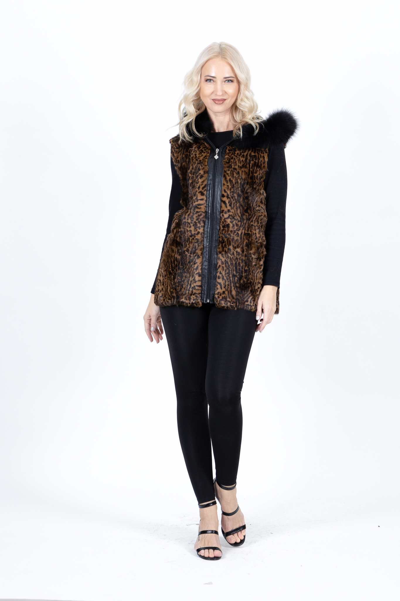 Γυναικείο γιλέκο γούνα leopar με κουκούλα , ρέλι μαύρη αλεπού και δερμάτινη φάσα στο φερμουάρ.
