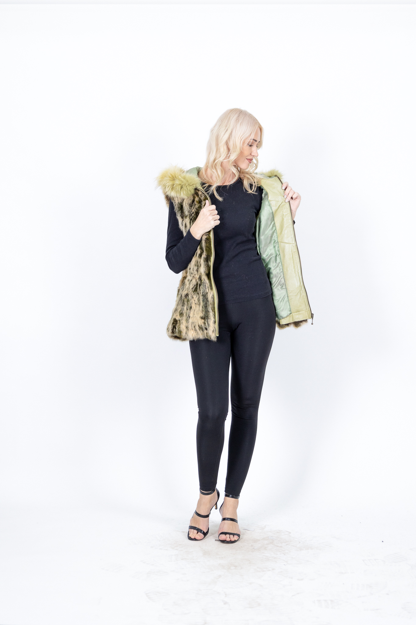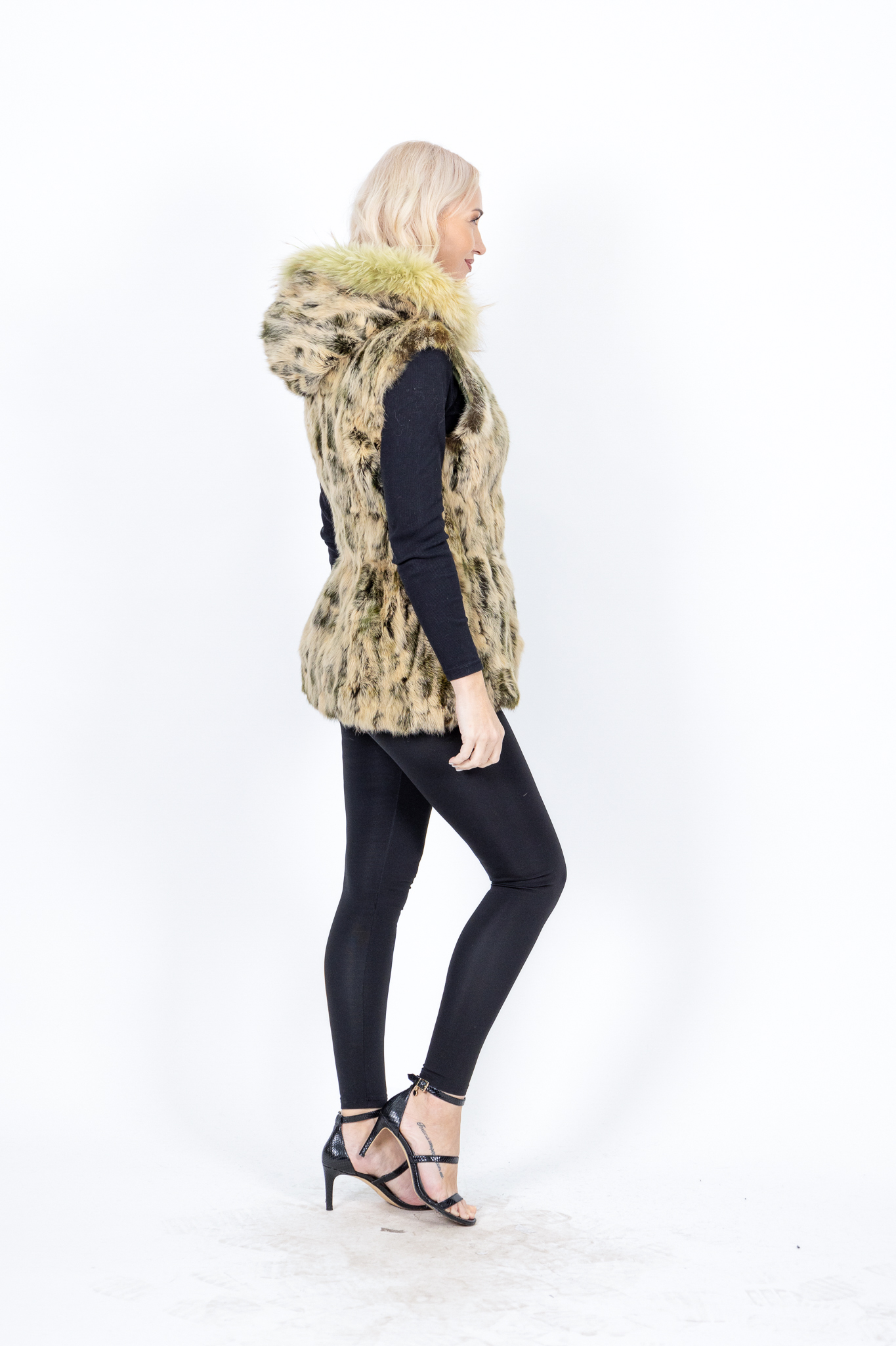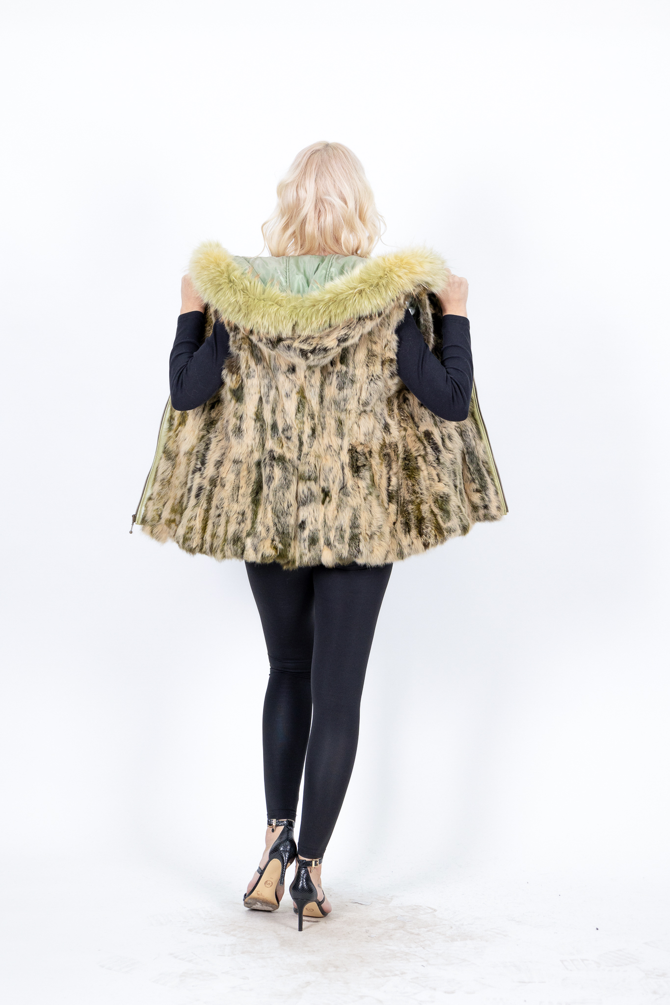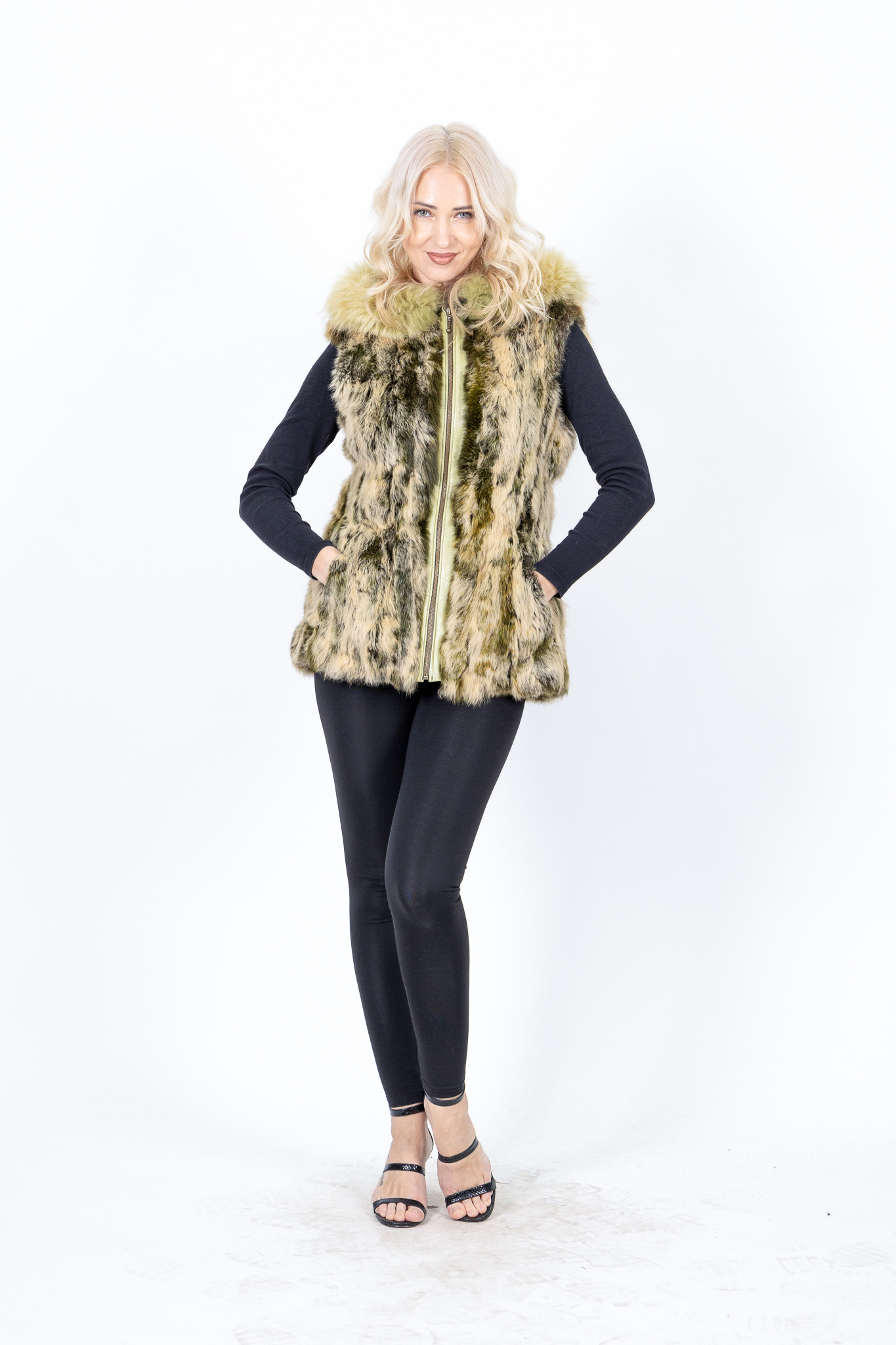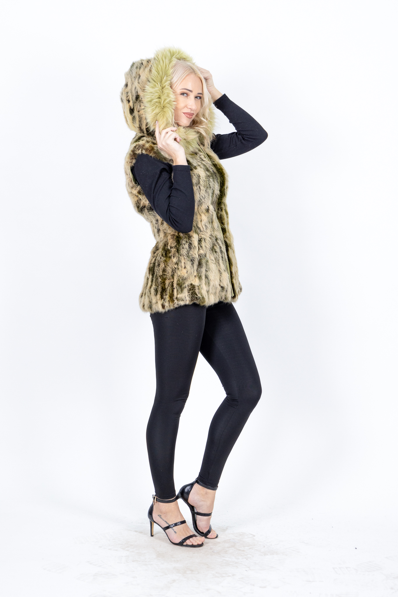 Γυναικεία γούνα γιλέκο ρεξ με δερμάτινες λεπτομέρειες και κουκούλα με ρέλι φιν ρακούν, κούμπωμα με φερνουάρ.