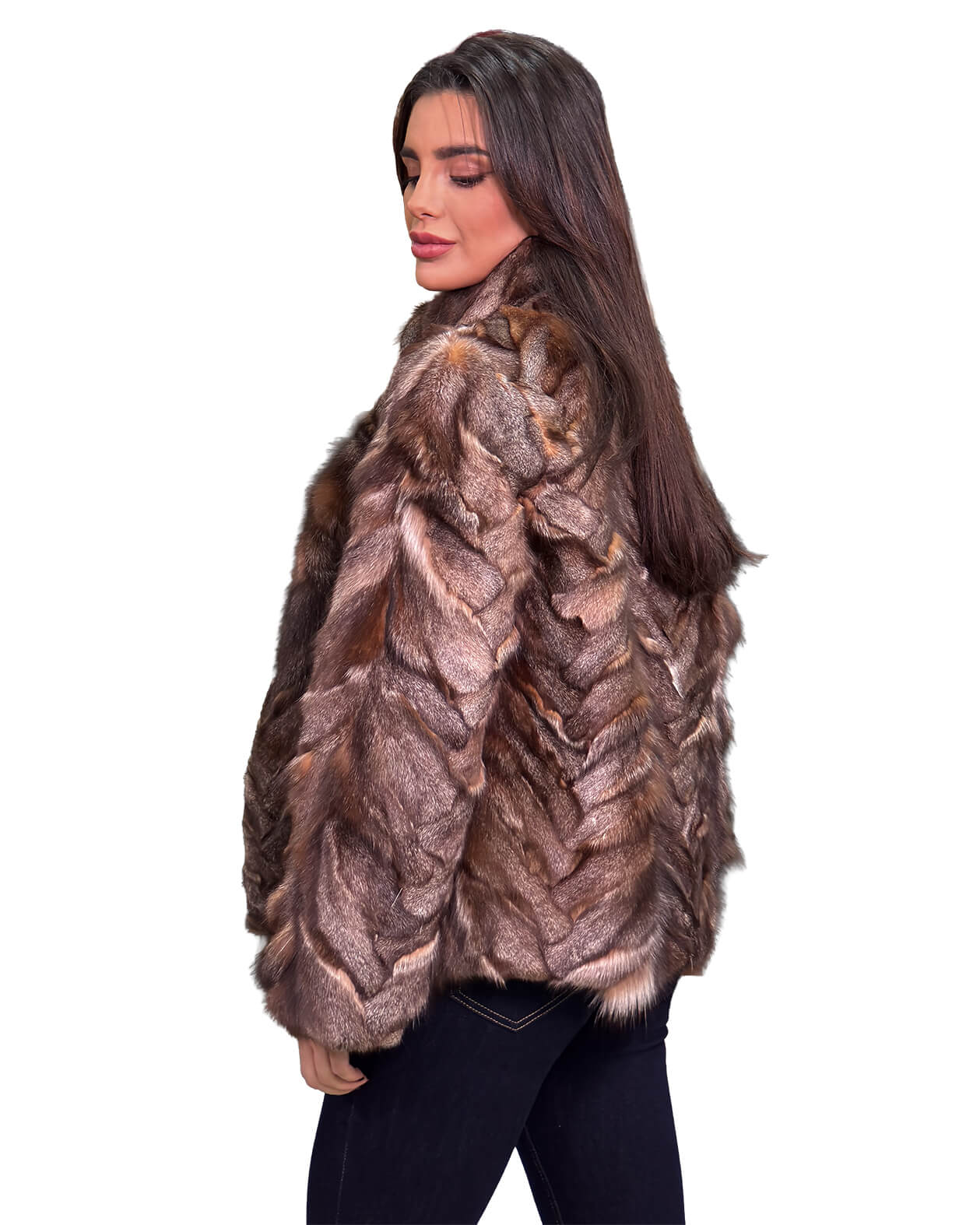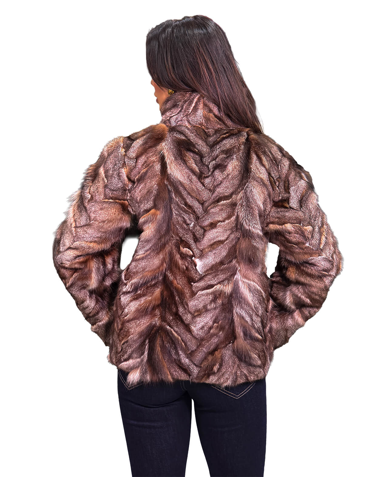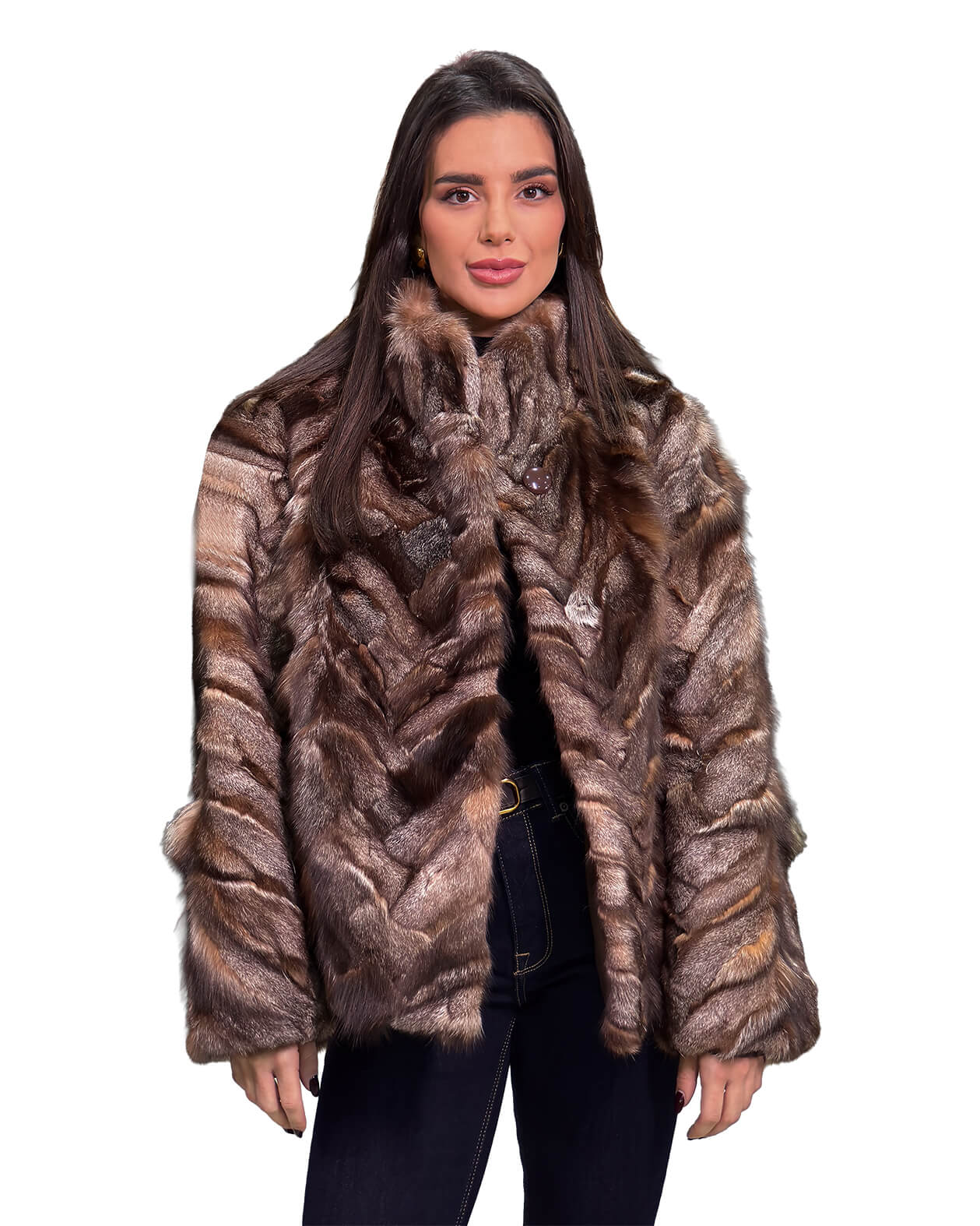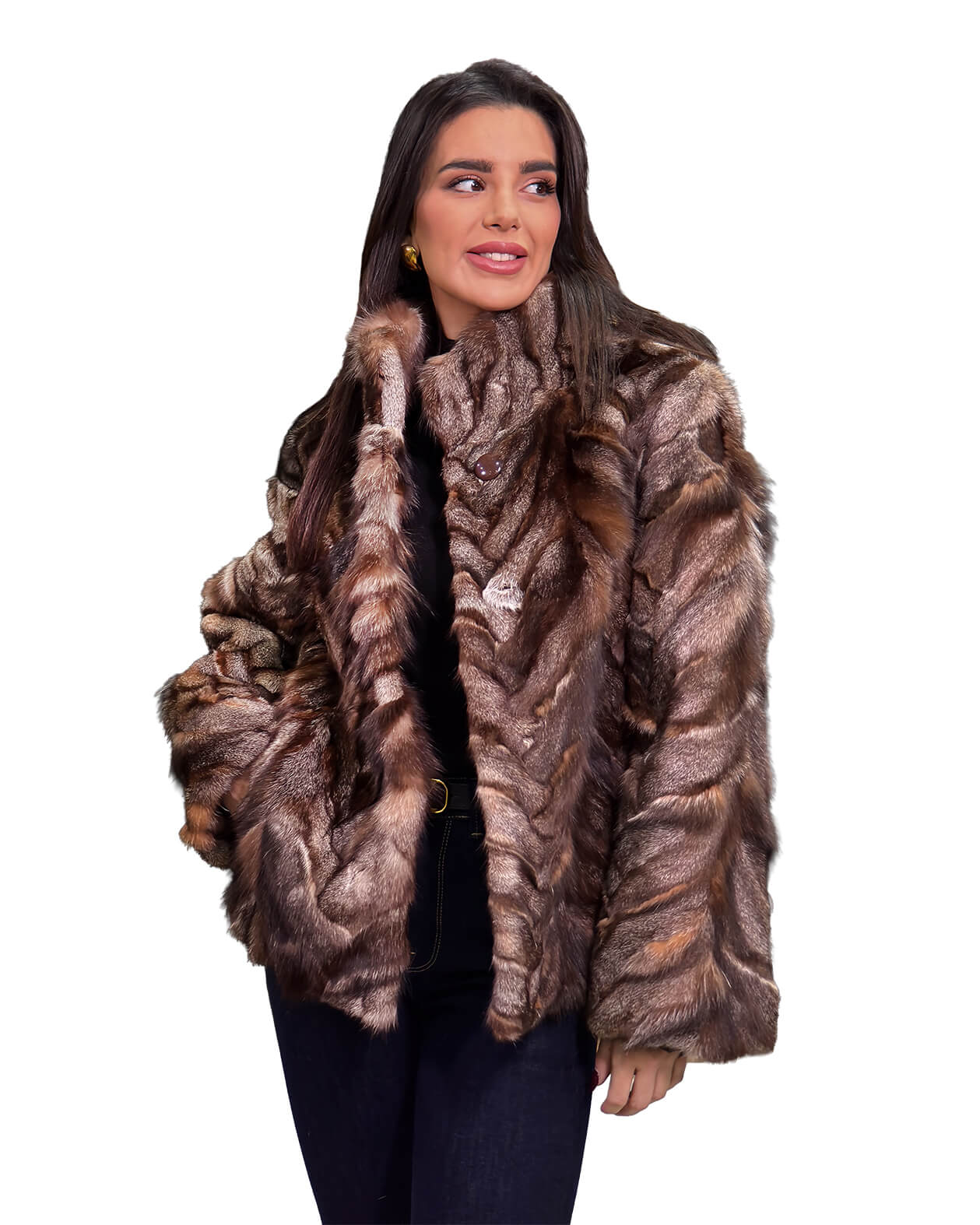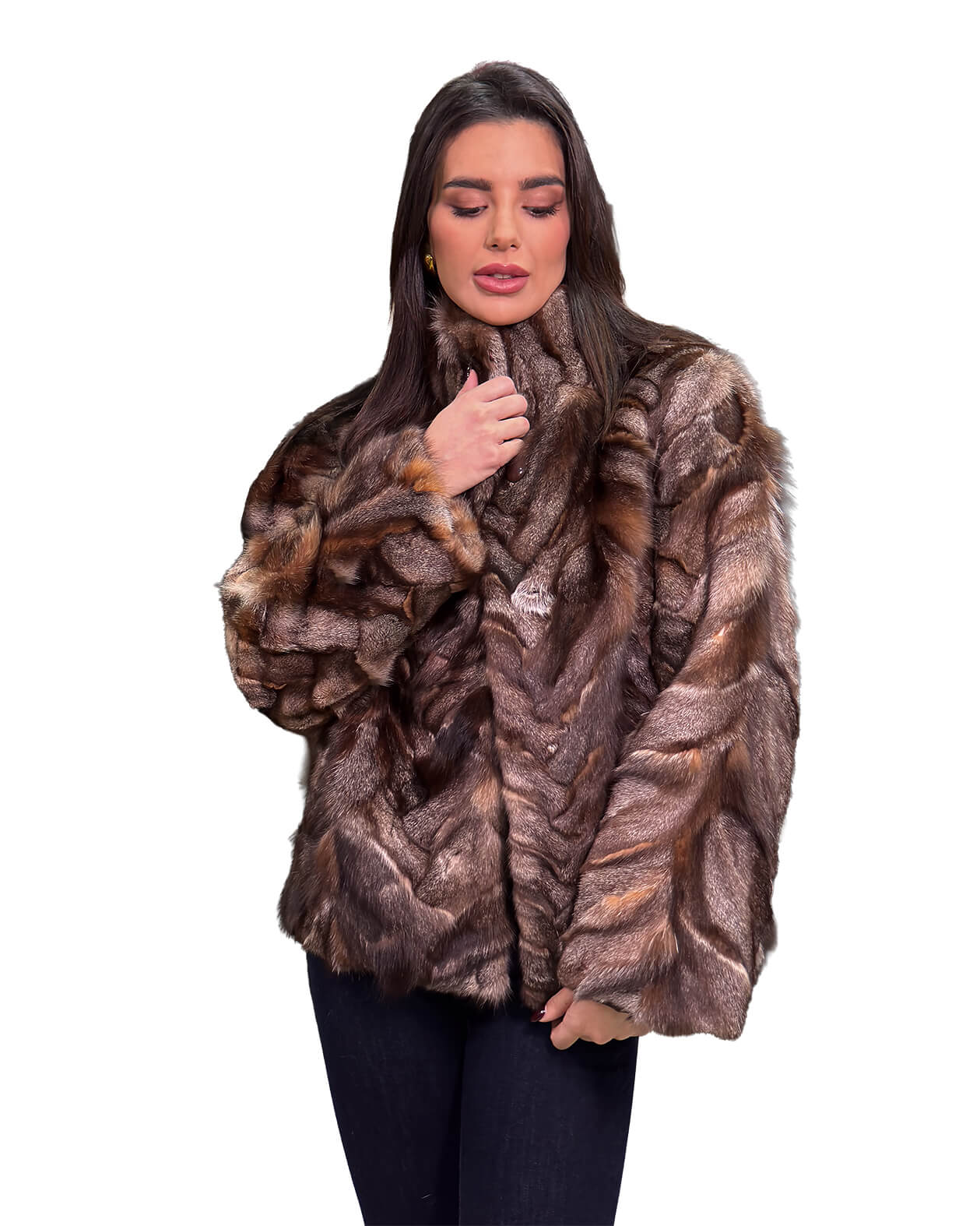 Γυναικεία ζακέτα από γούνα αλεπού σε γκρι καφέ απόχρωση με όρθιο γιακά.