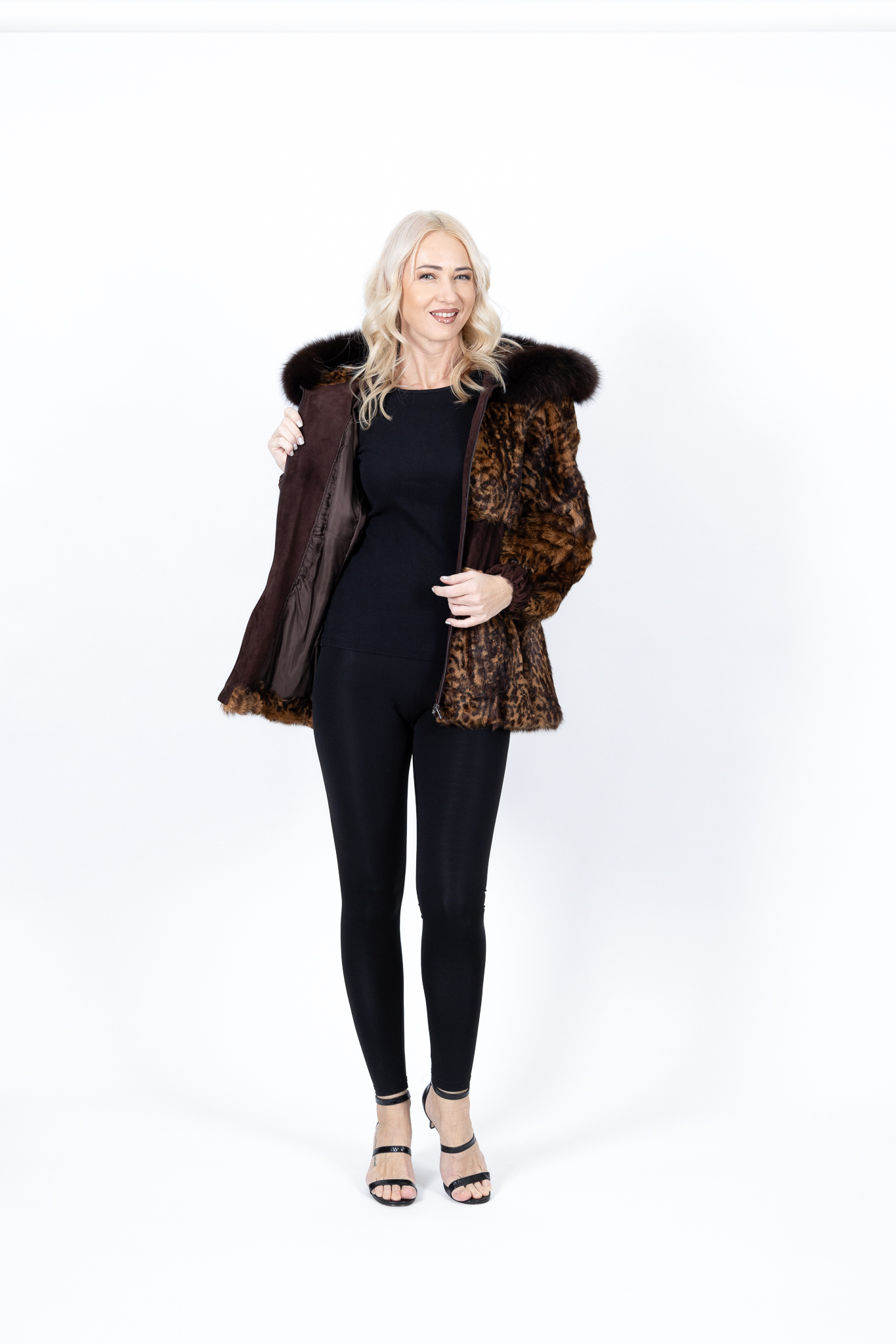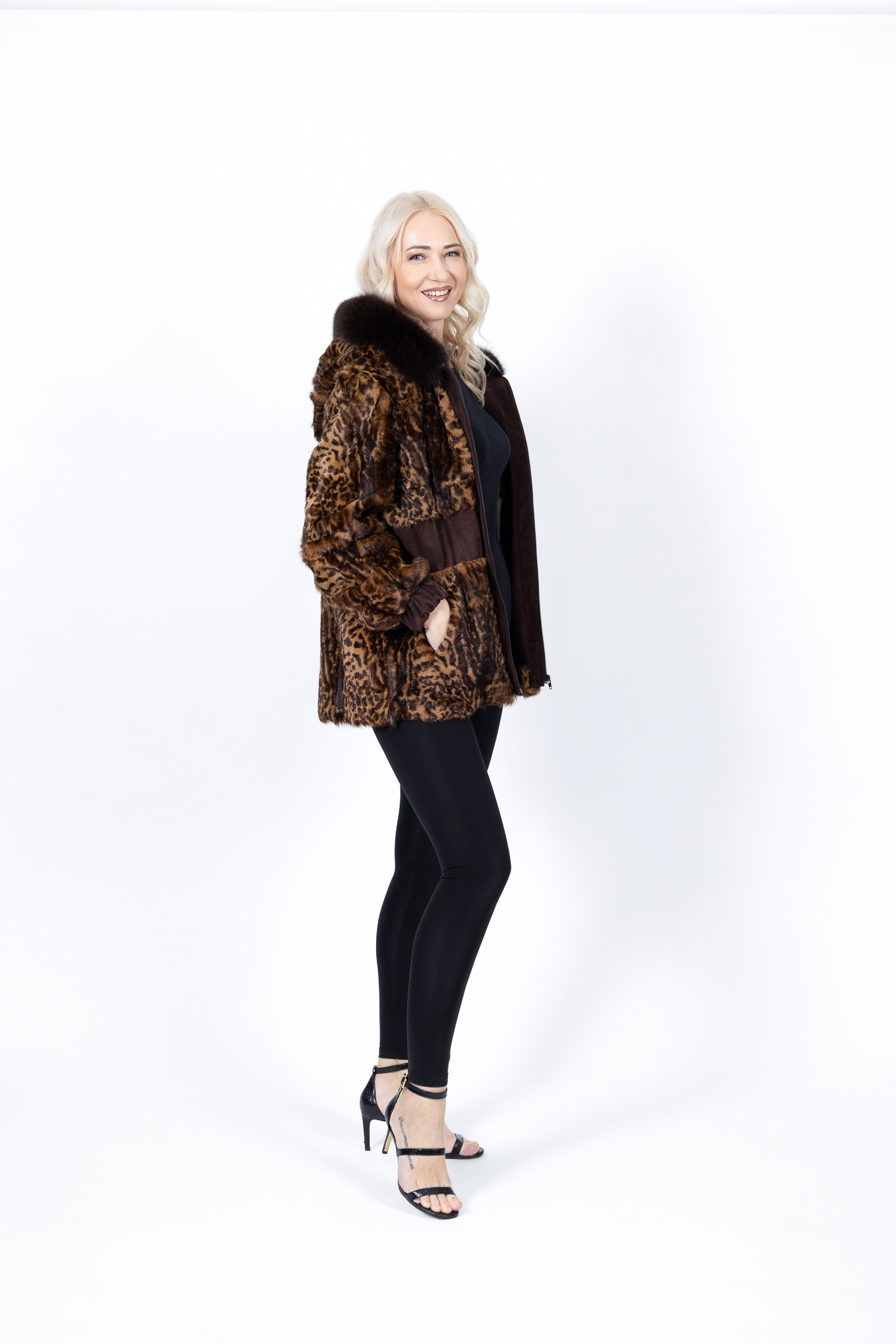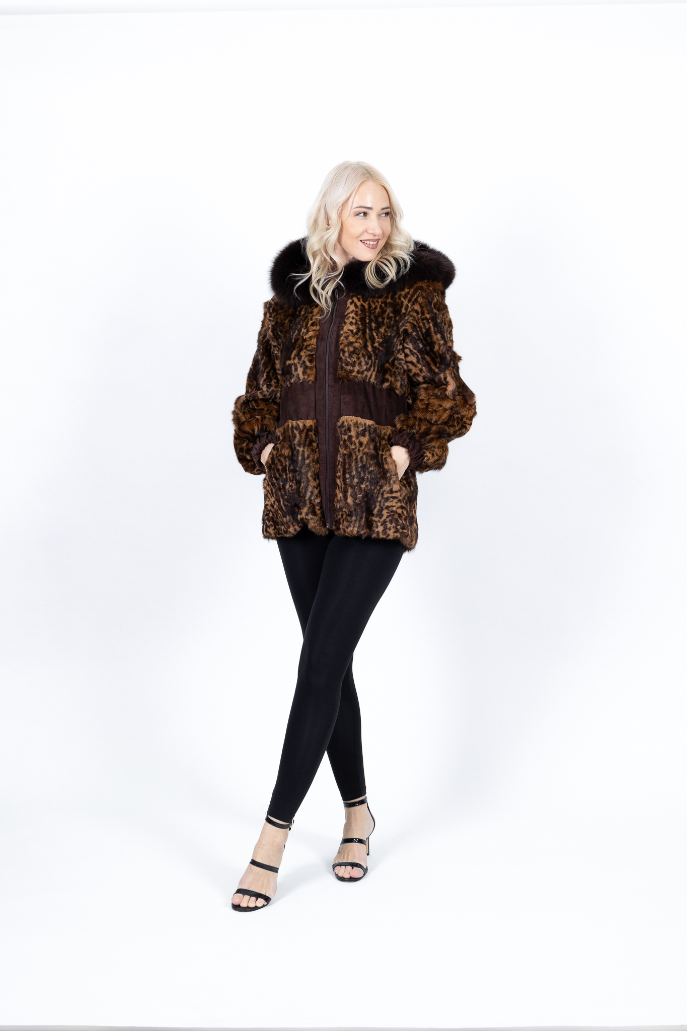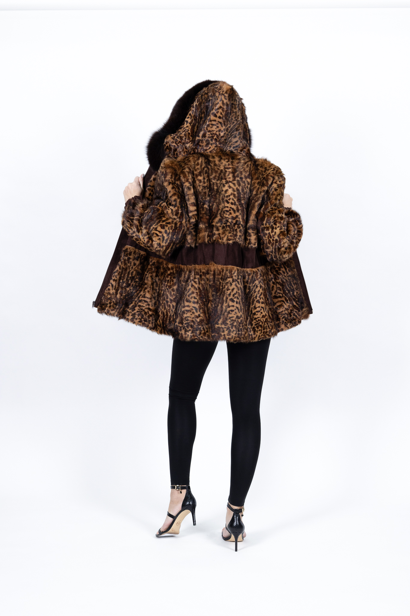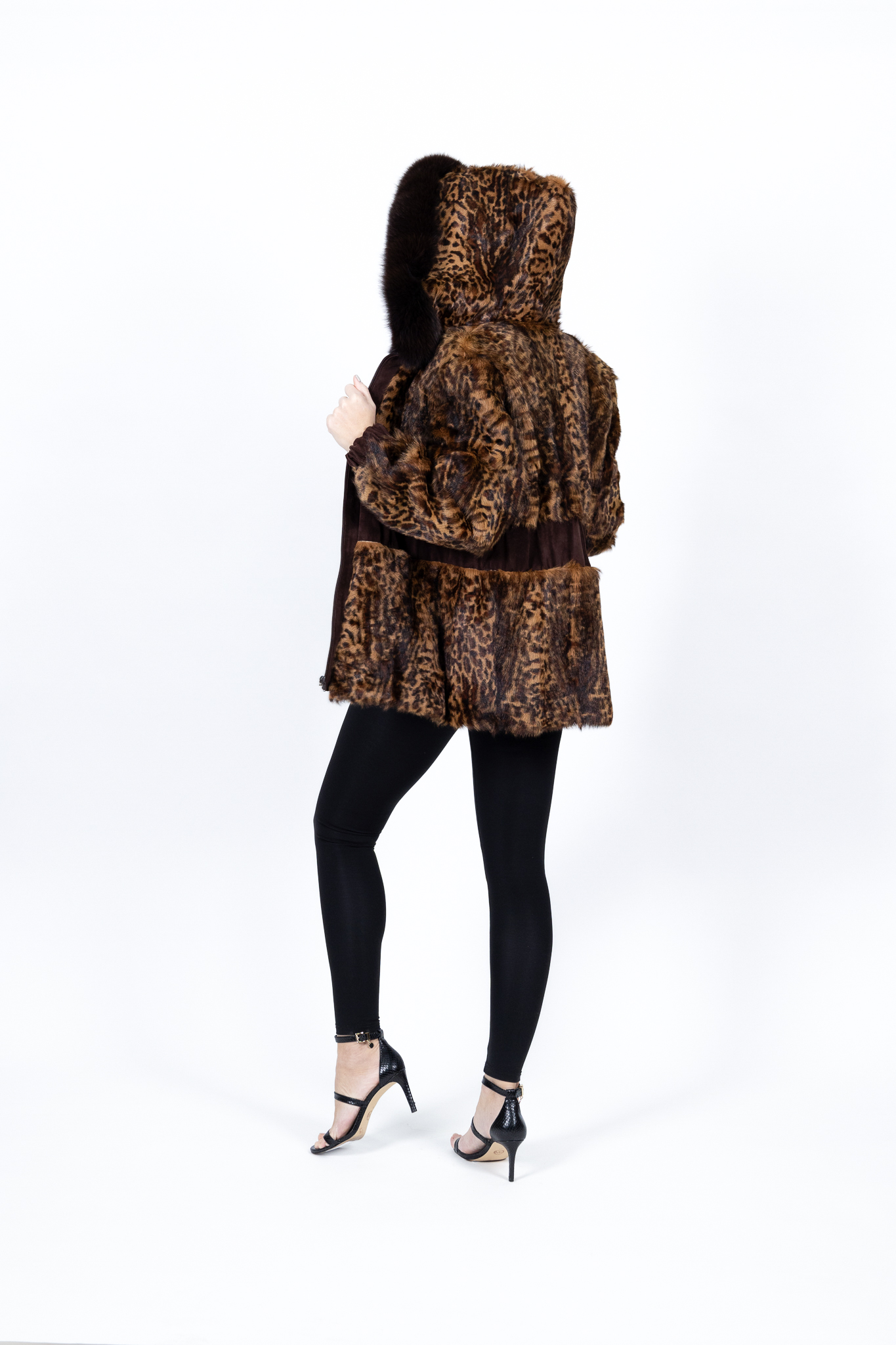 Γυναικεία ζακέτα με άνιμαλ πριντ λεοπάρ , έχει δερμάτινες λεπτομέρειες και κουκούλα με φυσική αλεπού ρελι.