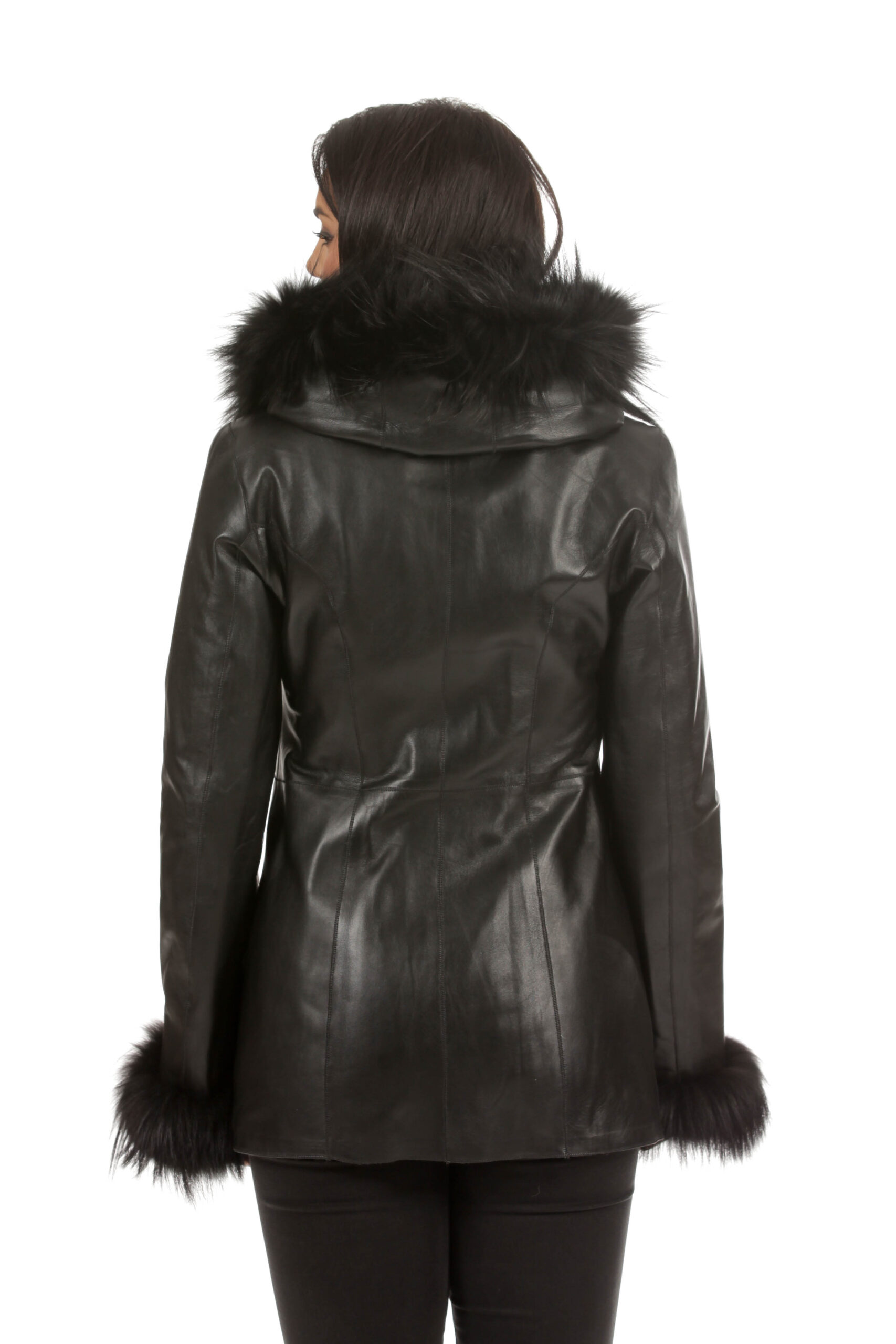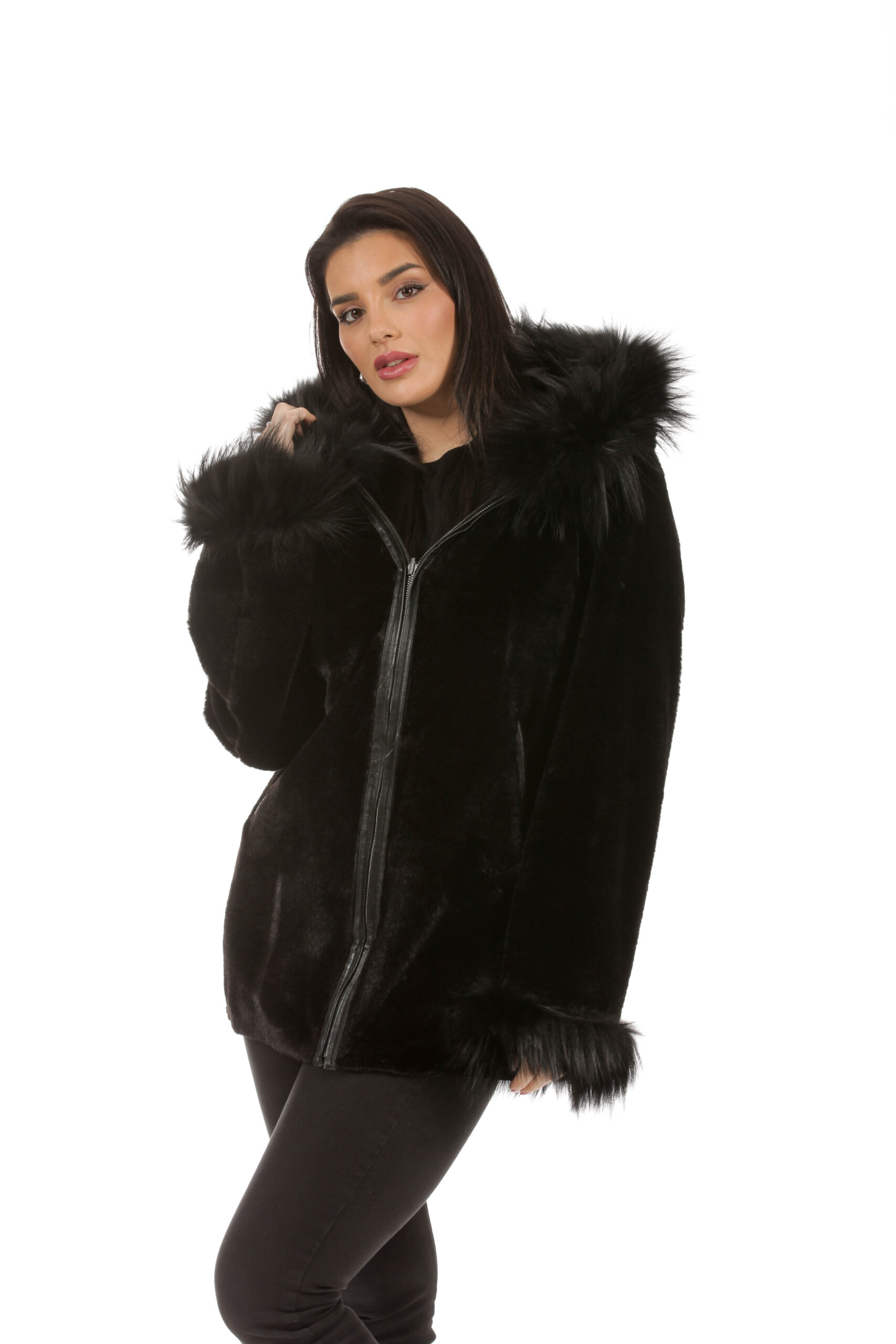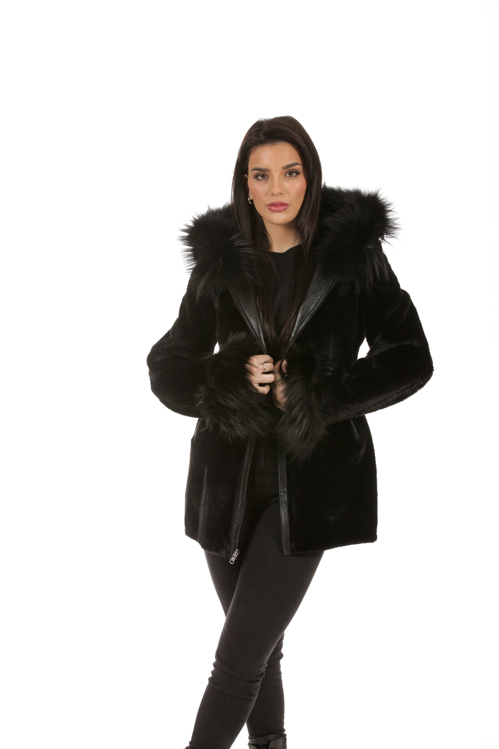 Γυναικεία δερμάτινη ζακέτα σε μαύρο μαλακό δέρμα αρνί με κουκούλα, η κουκούλα και τα μανίκια έχουν γούνα φυσική αλεπού. Η άλλη όψη έχει μαύρη οικολογική γούνα υψηλής ποιότητας .