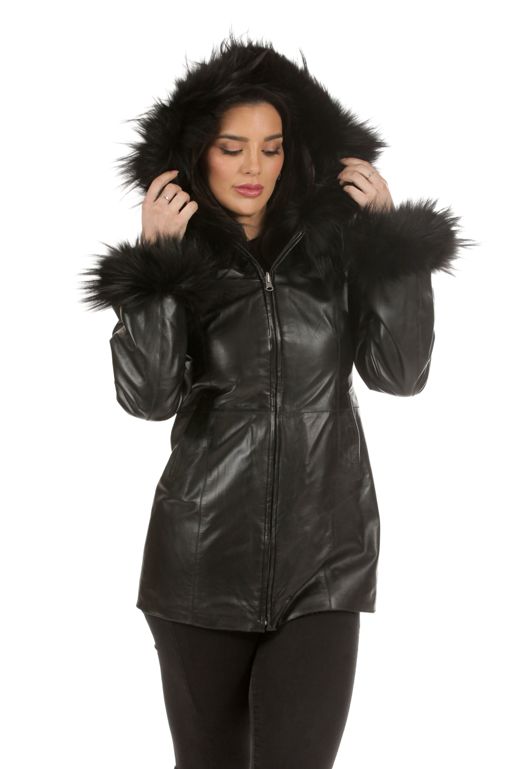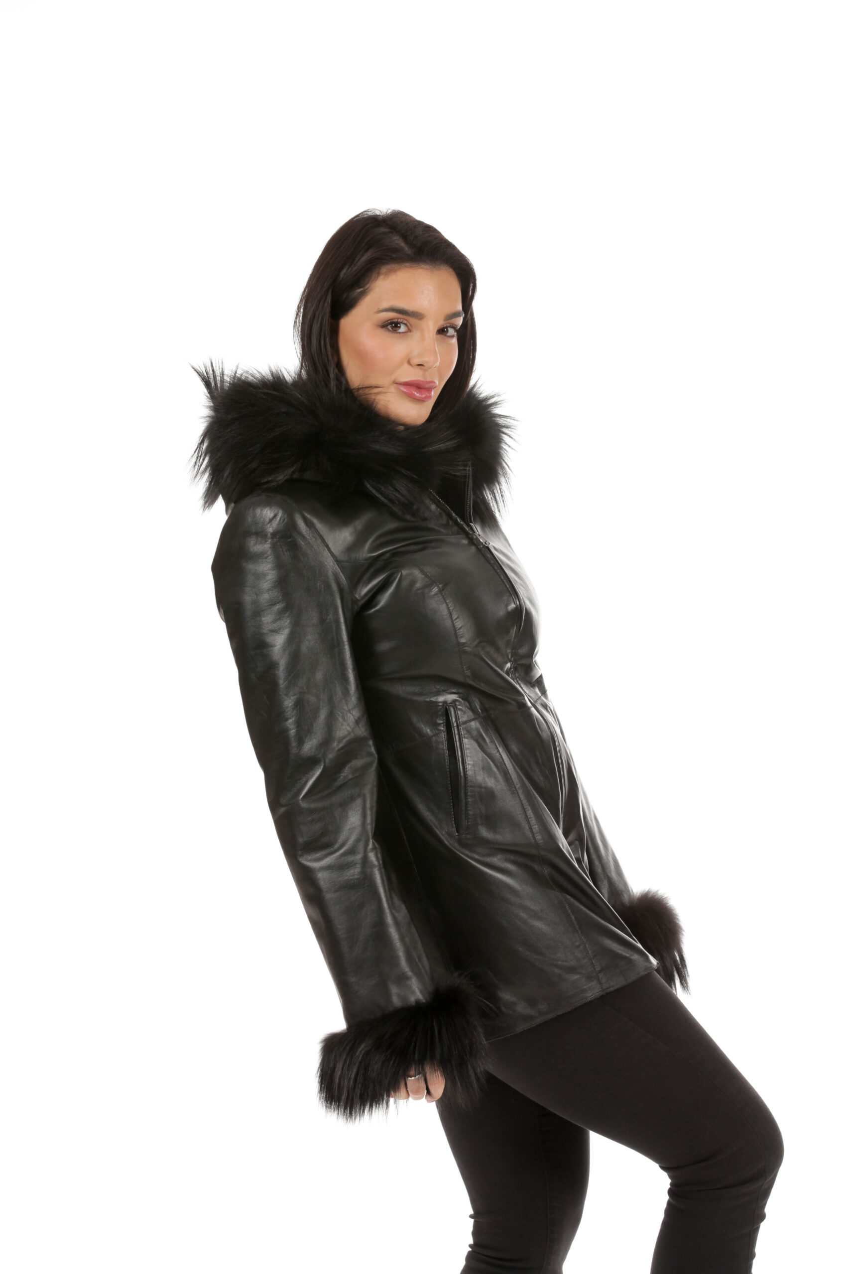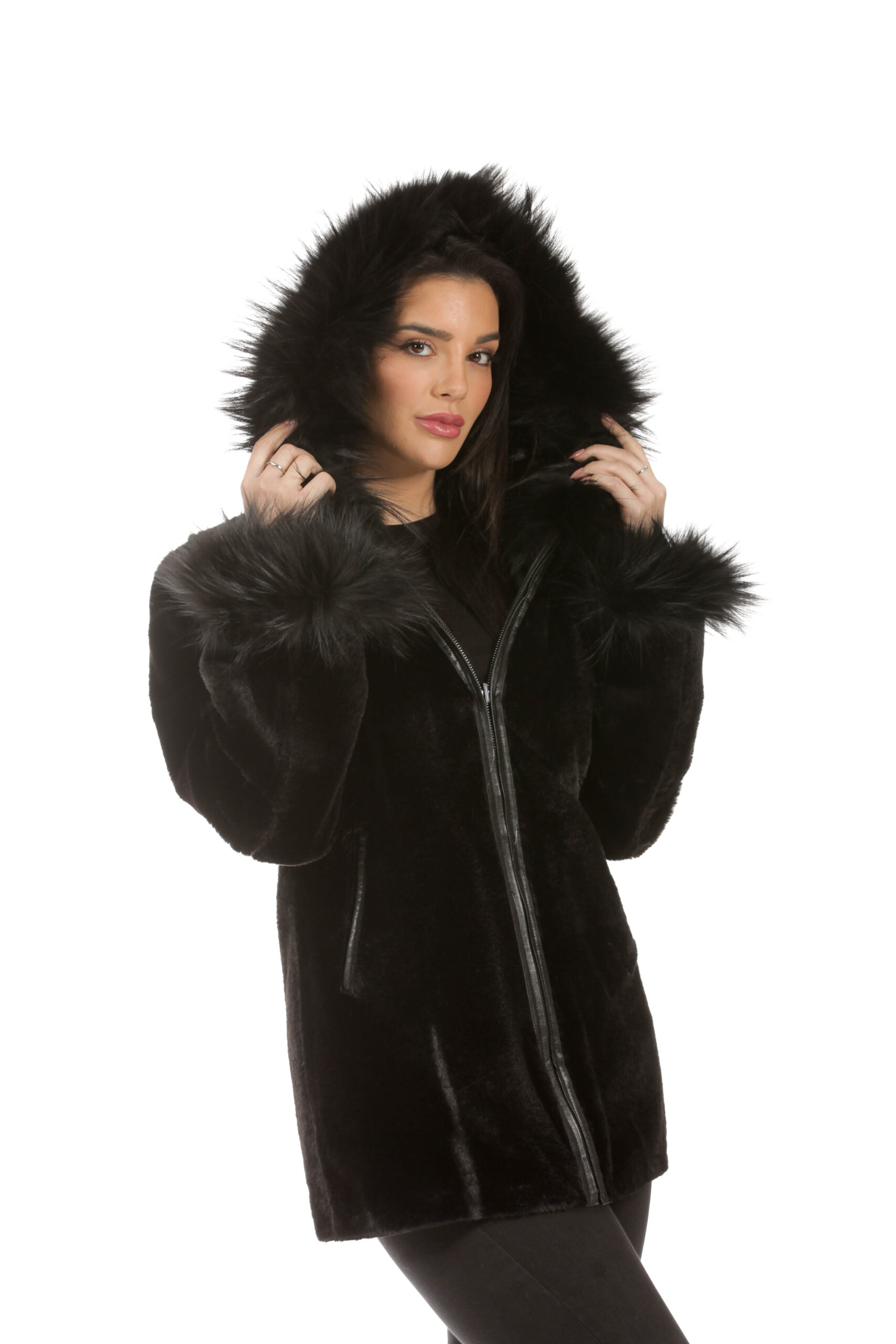 Γυναικεία δερμάτινη ζακέτα σε μαύρο μαλακό δέρμα αρνί με κουκούλα, η κουκούλα και τα μανίκια έχουν γούνα φυσική αλεπού. Η άλλη όψη έχει μαύρη οικολογική γούνα υψηλής ποιότητας .
