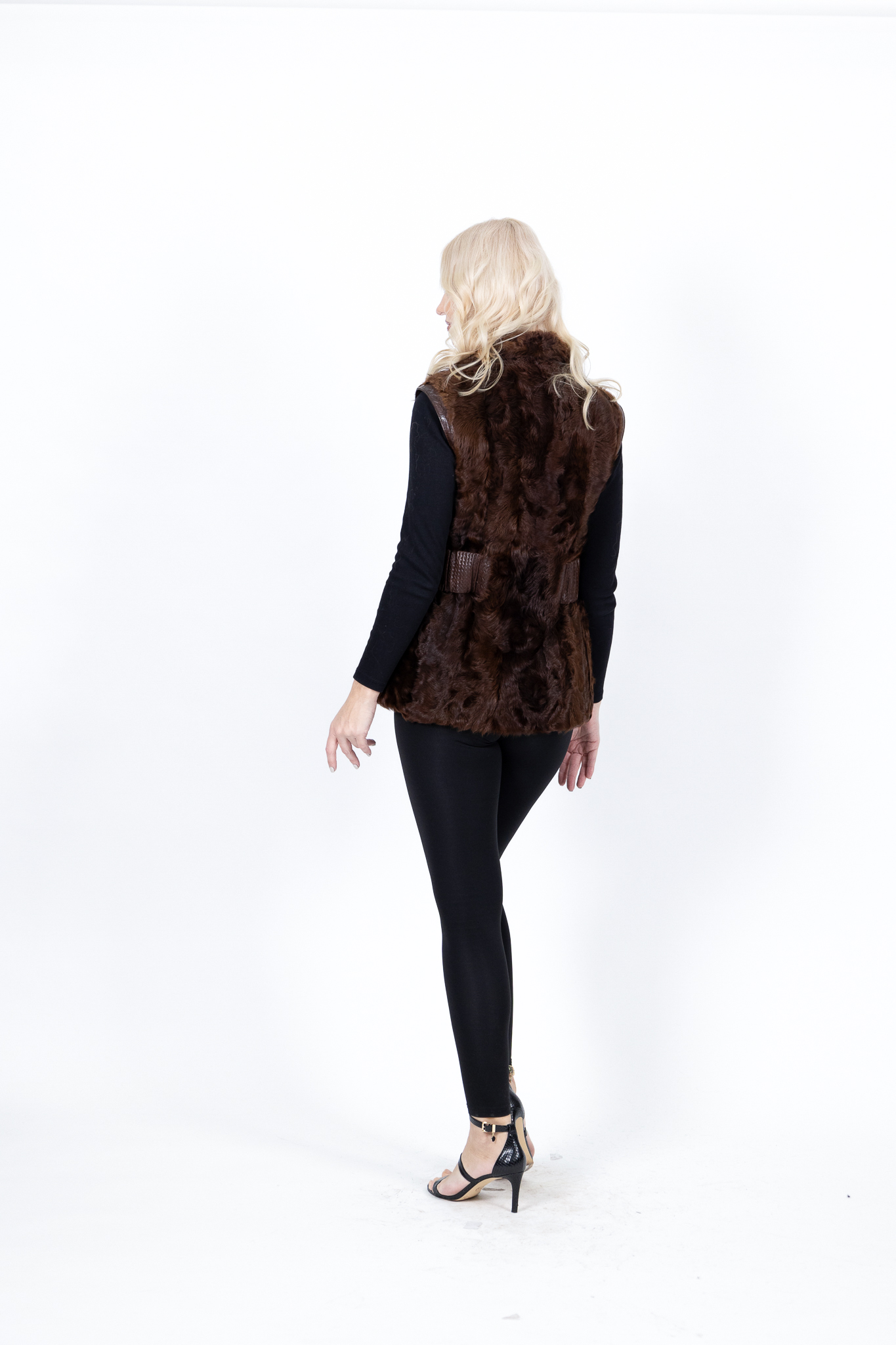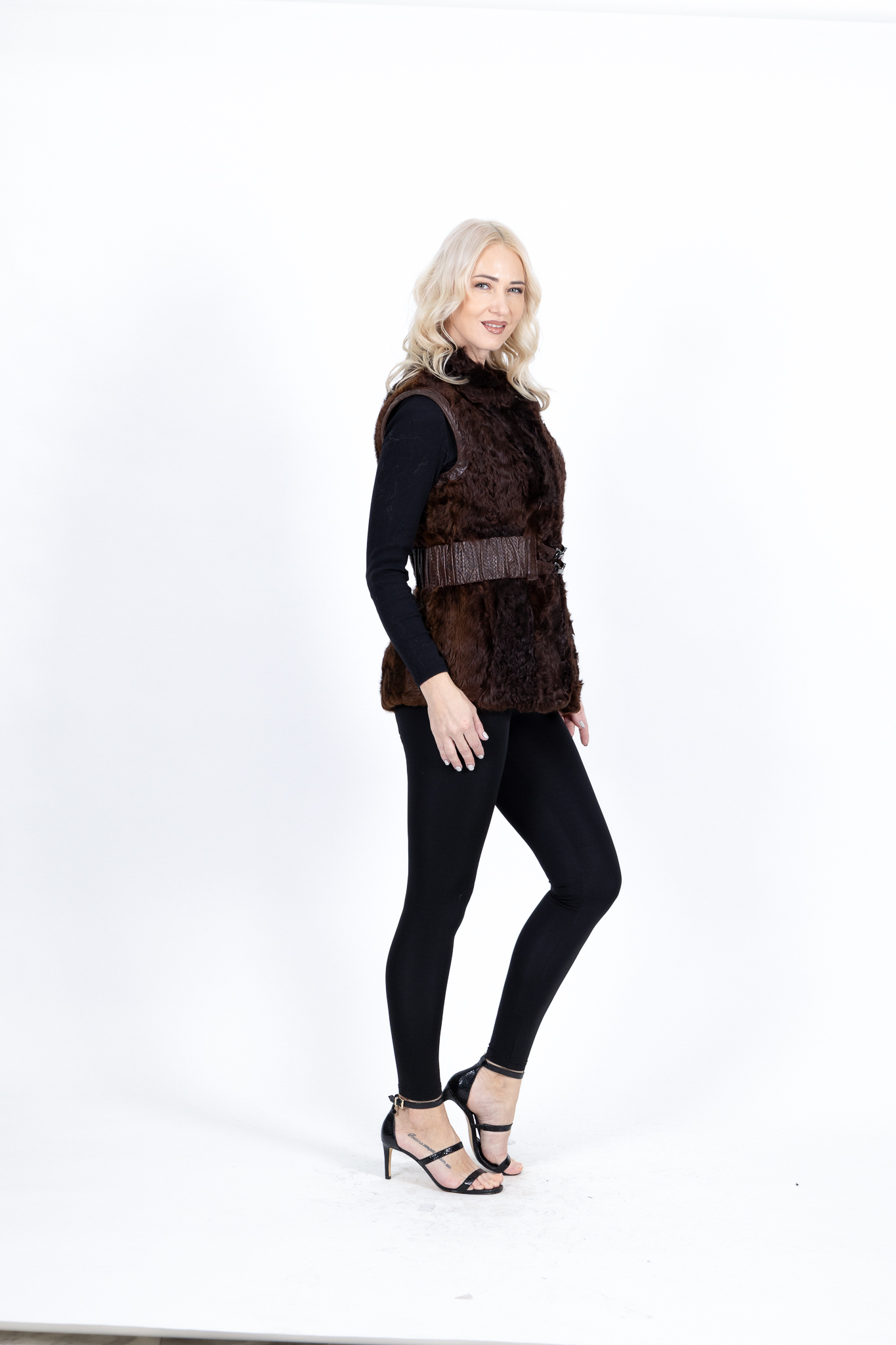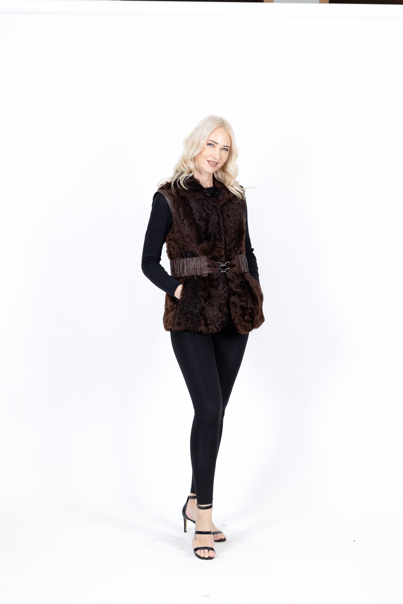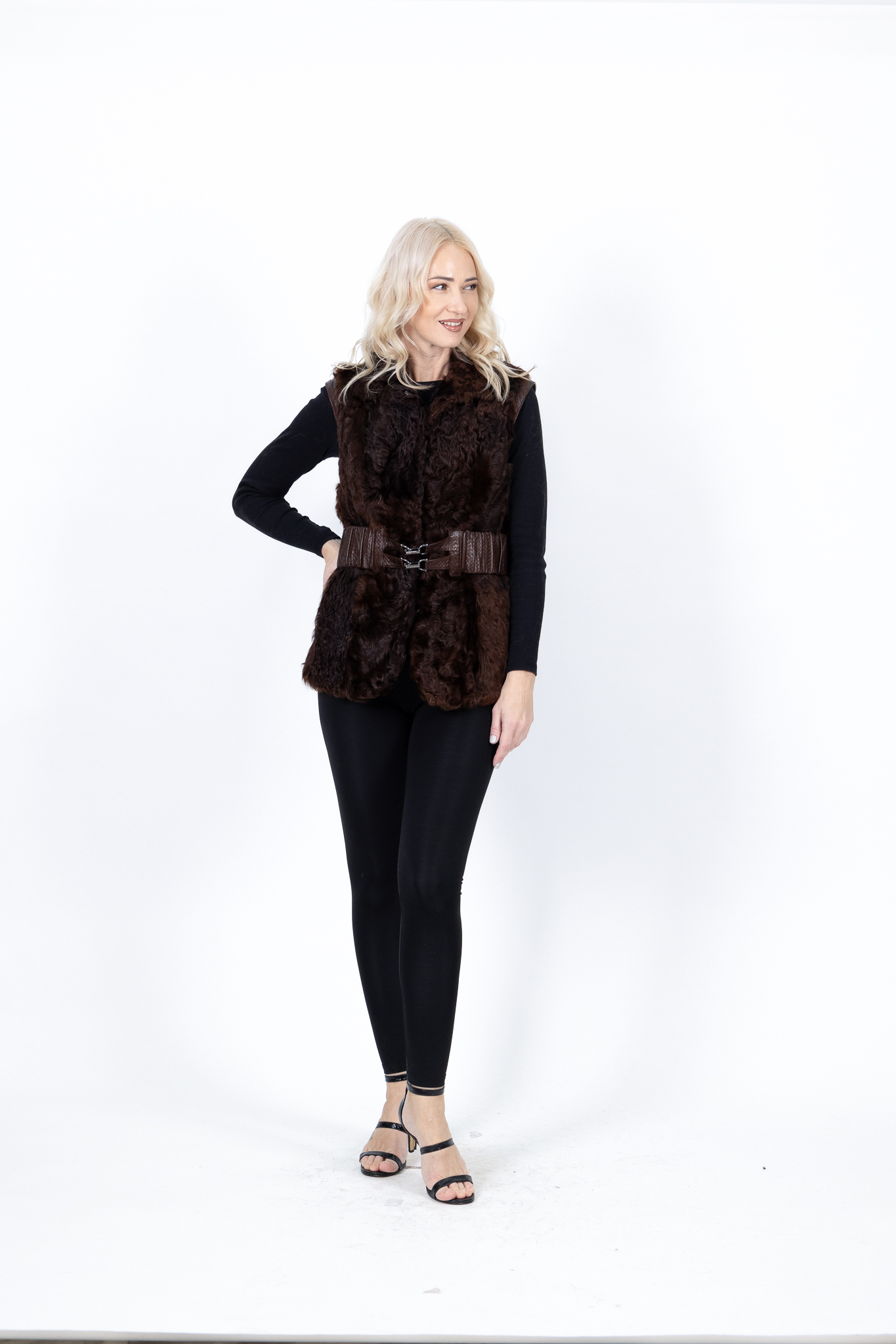 Γυναικείο γιλέκο οστραγκάν καφέ σκούρο με δερμάτινη σούρα στη μέση και μεταλλικό κούμπωμα.