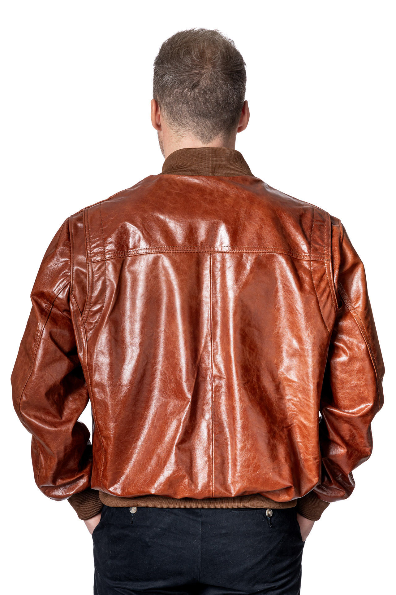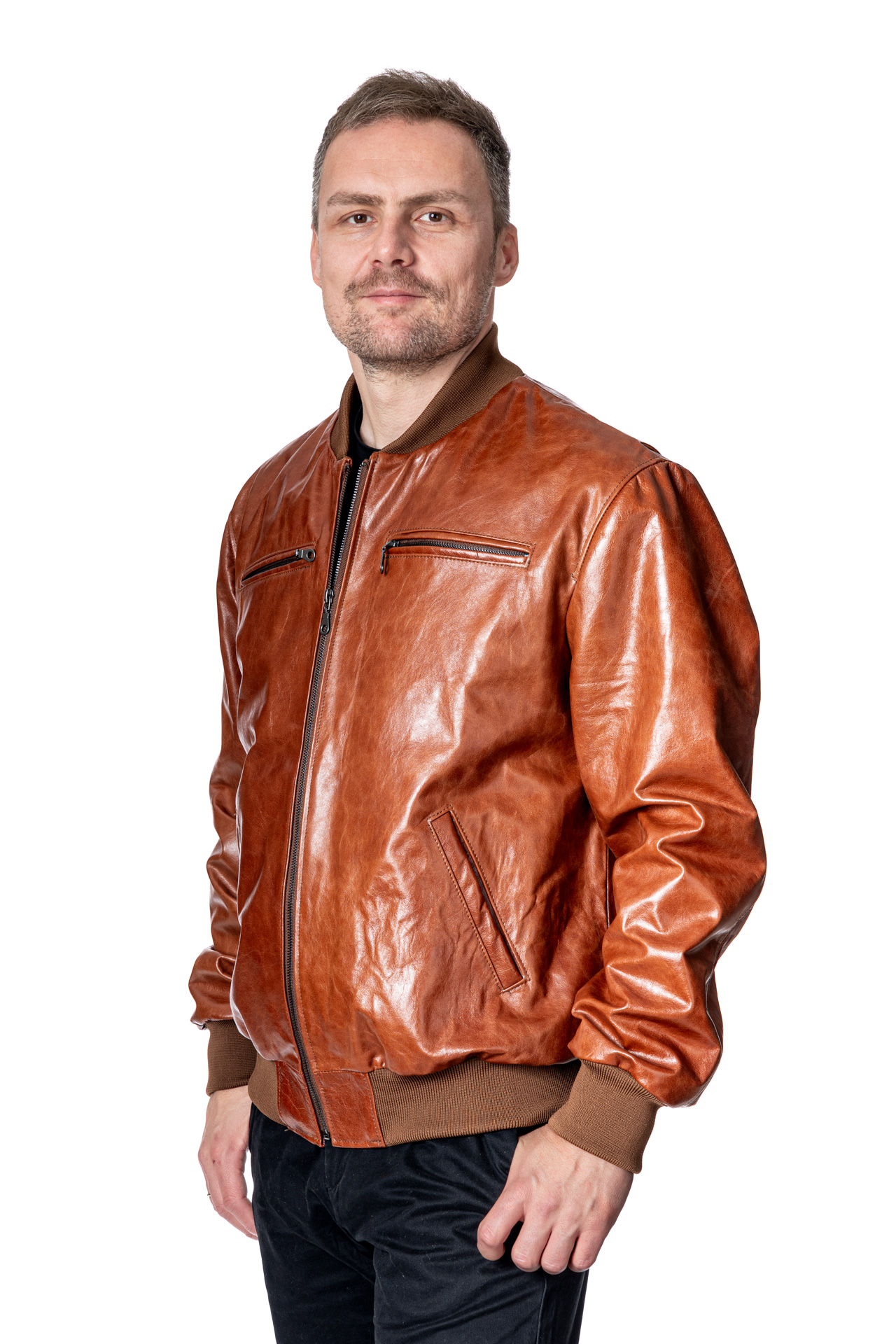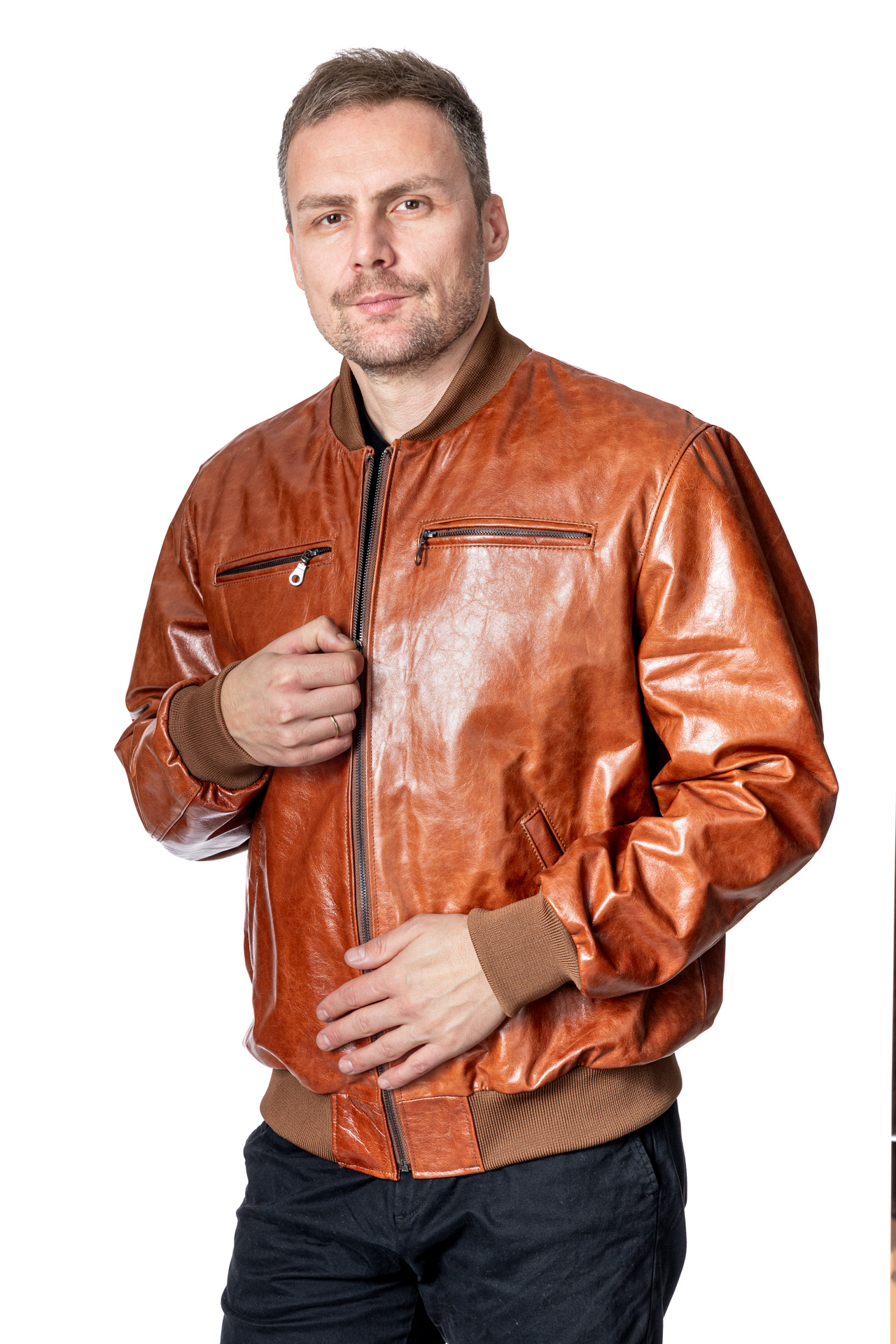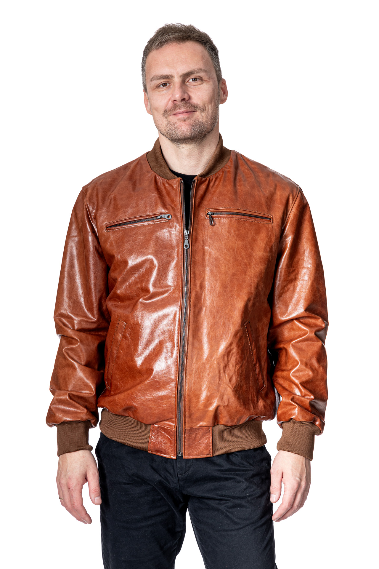 Ανδρικό δερμάτινο μπουφάν με λάστιχα σε ταμπά δέρμα κονιάκ μοσχάρι με γιακά collegeσε κανονική γραμμή με 2 εξωτερικές τσέπες με φερμουάρ στο στήθος και εσωτερικές τσέπες .